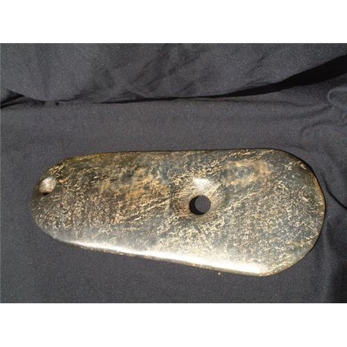 Large Neolithic period ceremonial axe with a central perforation (Hao) drilled in conical shape from both sides, typical for Neolithic period. A small perforation was drilled in the apical central portion for suspension purpose and having the same characteristics as the larger perforation. Length: 11.8" (30 cm.). Width: 5.5" (14 cm.). Estimated value: $10.000.