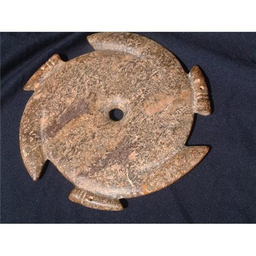 Large Neolithic period ceremonial disk of helicoidal shape decorated with 3 cicada on the edge and alternating with 3 teeth-like elongations. It has a central perforation drilled from both sides in a conical shape typical for Neolithic carvings. Diameter: 8.2" (21 cm.). Estimated value: $6000. Provenance: Dr. Veleanu's collection, the renown author of collectors illustrated book: "Jade, 5000 BC to 1912 AD, Guide to collectors".