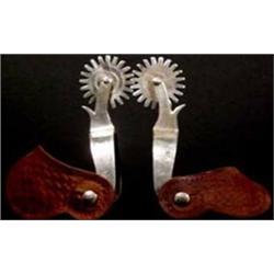 Large Nickleplated Engraved Spurs Owned by Bat-Jac - John Wayne's Production Company. Nicely engraved with JW on the side. John Wayne's spurs?? Estimate $1,500-$2,500.