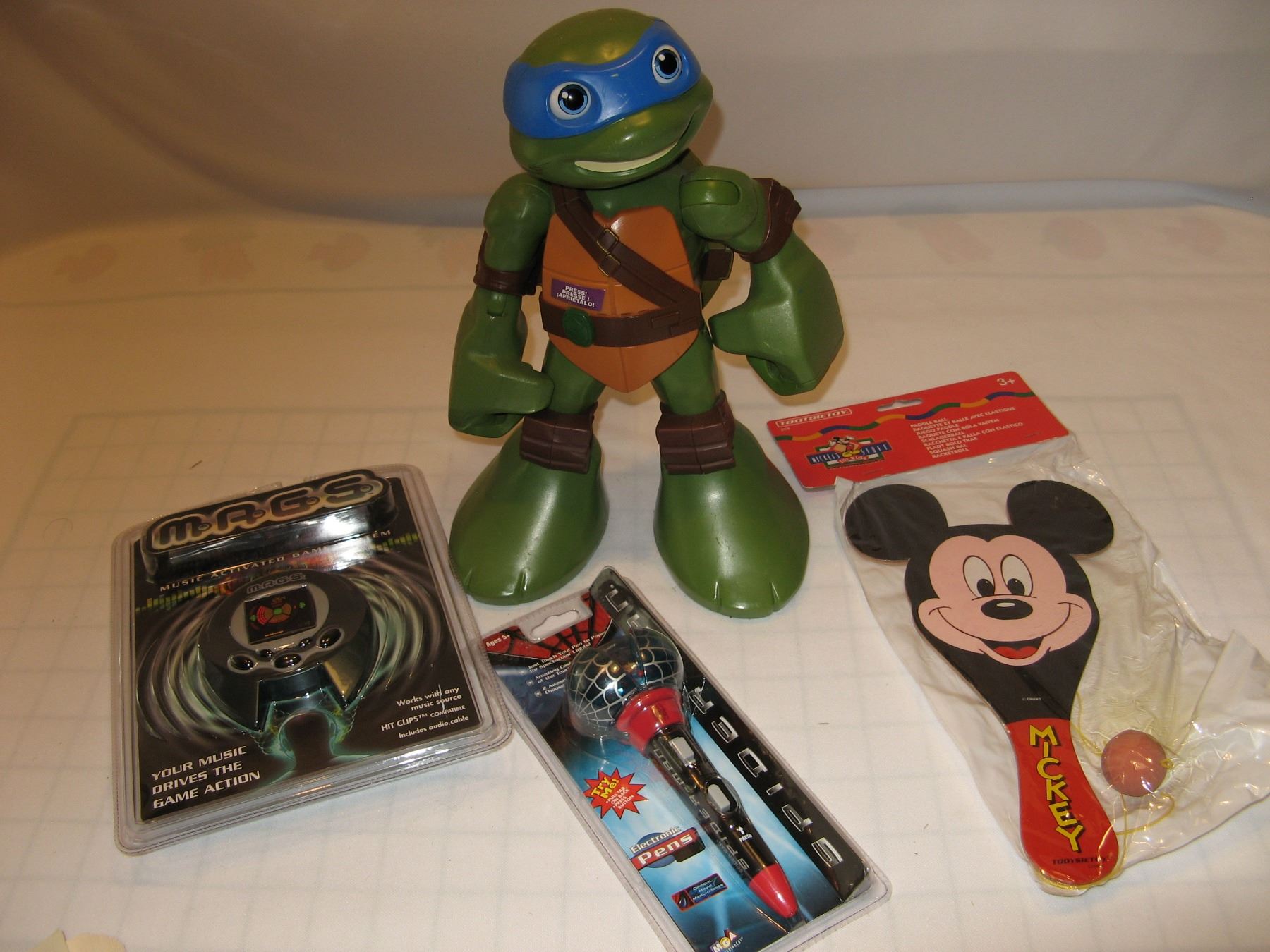 Large Ninja Turtle Battery Operated Toy (works, missing battery cover), MAGS Music Game System, Spiderman Electronic Pen, Mickey Mouse Paddle Ball