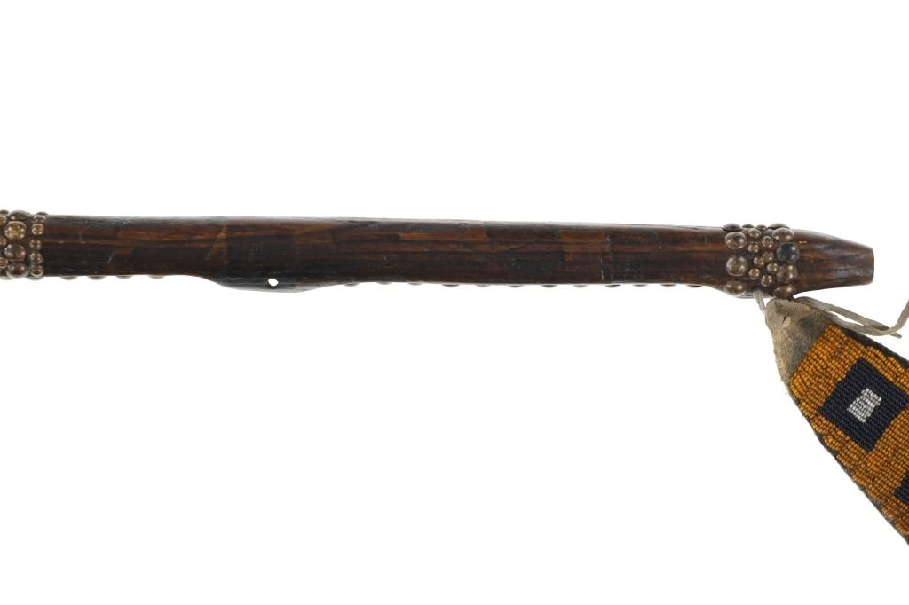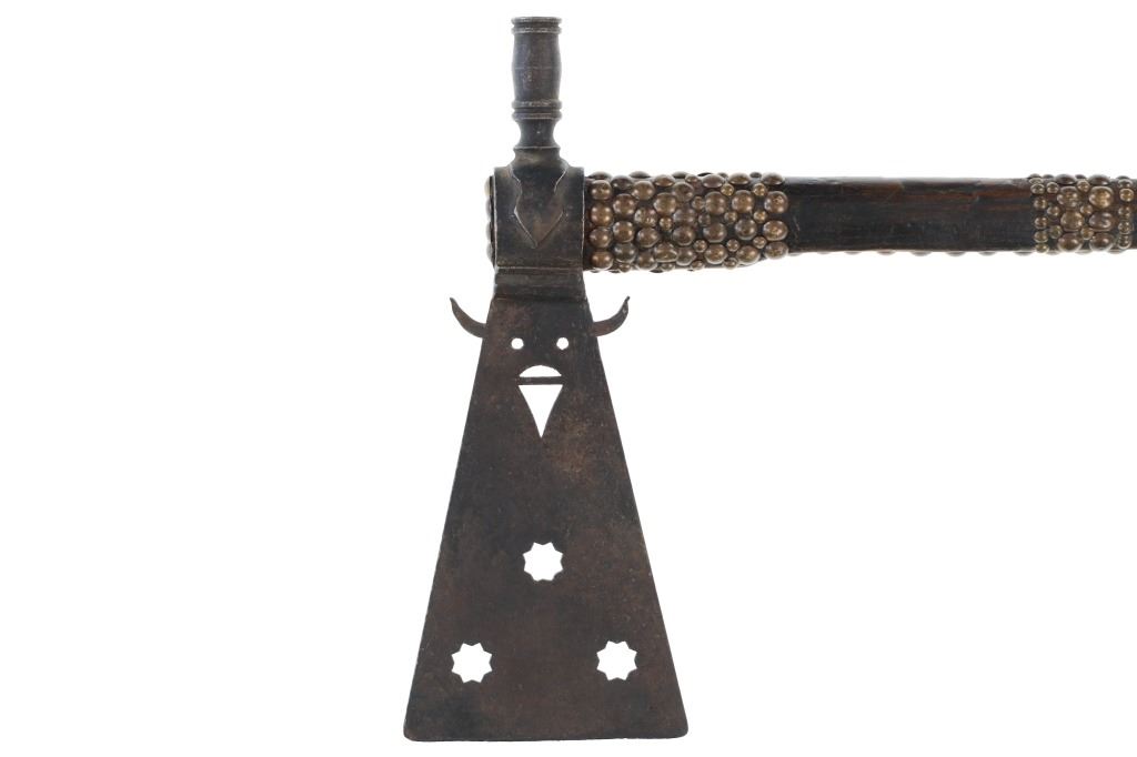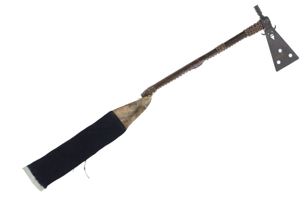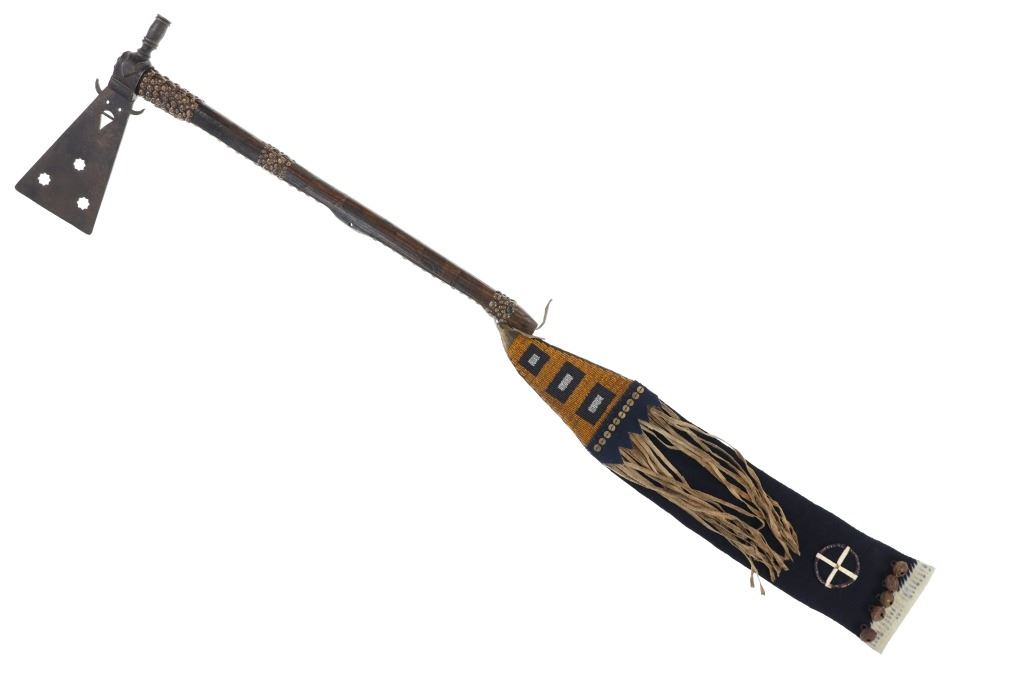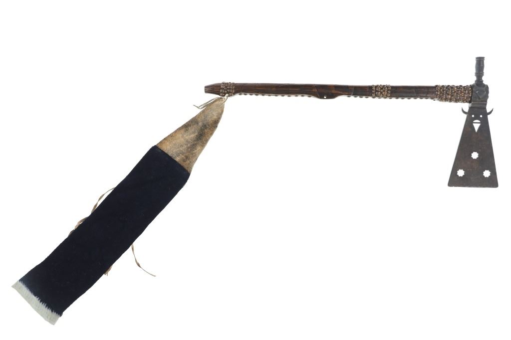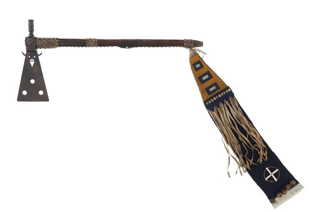 This is a large, western pattern pipe tomahawk with “Cave-Dweller” and eight-point star cutouts along with a beaded drop from the Northern Plains. The pipe tomahawk head shows a flaring large triangular typical western pattern blade with three eight-point star cutouts and atop of the blade two circles, triangle and crescent moon cutouts in the shape of a face with two upward curled spurs in the shape of horns. Also has a Buffalo / Bison like design. The eye is tear drop with large moldings and tall vase like bowl. The handle is soldi ash wood with hot file brandings, dark coloring and various brass and metal tackings. There is a drilled spot for a drop above and below the gripping area. The bottom has an Indian hide and trade clothe beaded and quilled drop. The drop shows glass trade beads in a classic tab design showing colors greasy yellow, chalk white, and cobalt. There are also brass disc beads, metal hawk bells and a rawhide parfleche wheel wrapped in porcupine quillwork in colors of blue and natural cream white. The tomahawk is from a Missouri private collection and displays wonderfully. Tomahawk itself measures 25.5-inches long with the head being 11.25-inches long and 4 3/8-inches long across the bottom of the blade. Drop itself is 26-inches long by 4.75-inches wide.