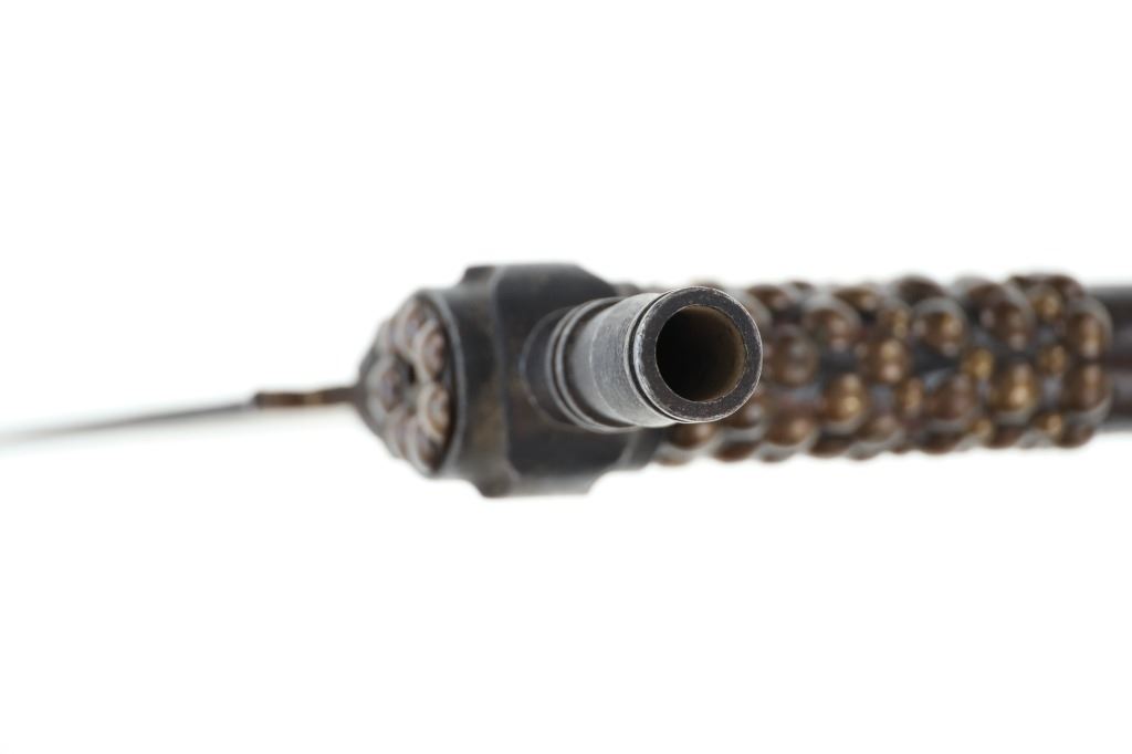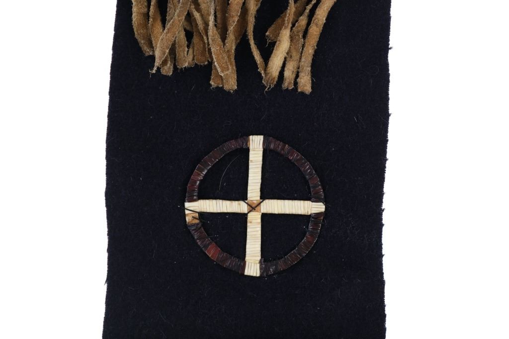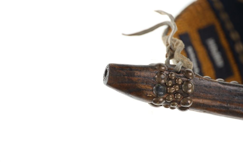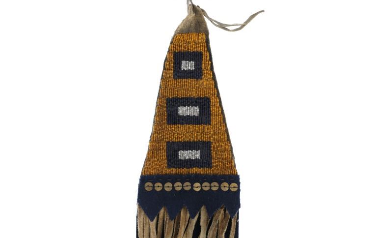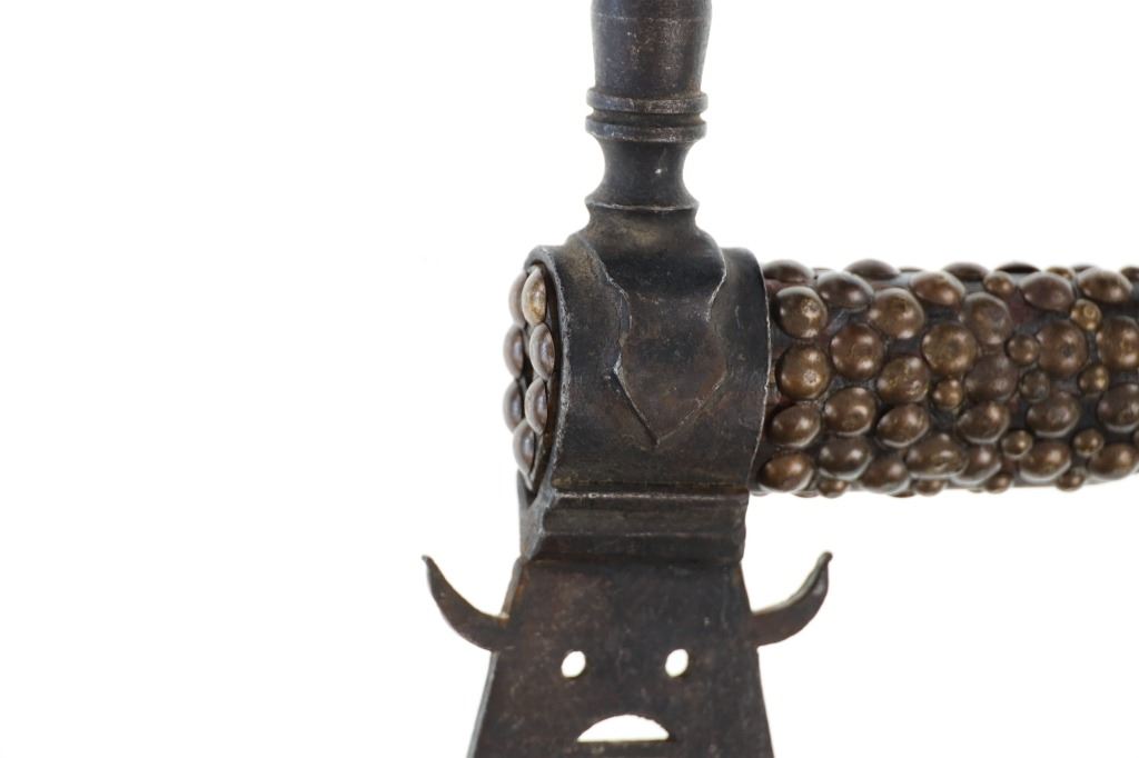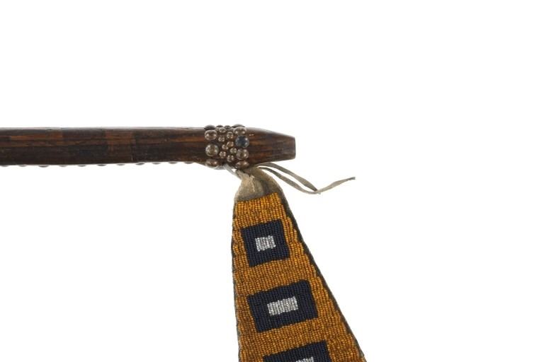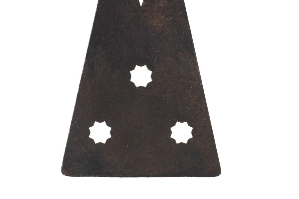 This is a large, western pattern pipe tomahawk with “Cave-Dweller” and eight-point star cutouts along with a beaded drop from the Northern Plains. The pipe tomahawk head shows a flaring large triangular typical western pattern blade with three eight-point star cutouts and atop of the blade two circles, triangle and crescent moon cutouts in the shape of a face with two upward curled spurs in the shape of horns. Also has a Buffalo / Bison like design. The eye is tear drop with large moldings and tall vase like bowl. The handle is soldi ash wood with hot file brandings, dark coloring and various brass and metal tackings. There is a drilled spot for a drop above and below the gripping area. The bottom has an Indian hide and trade clothe beaded and quilled drop. The drop shows glass trade beads in a classic tab design showing colors greasy yellow, chalk white, and cobalt. There are also brass disc beads, metal hawk bells and a rawhide parfleche wheel wrapped in porcupine quillwork in colors of blue and natural cream white. The tomahawk is from a Missouri private collection and displays wonderfully. Tomahawk itself measures 25.5-inches long with the head being 11.25-inches long and 4 3/8-inches long across the bottom of the blade. Drop itself is 26-inches long by 4.75-inches wide.