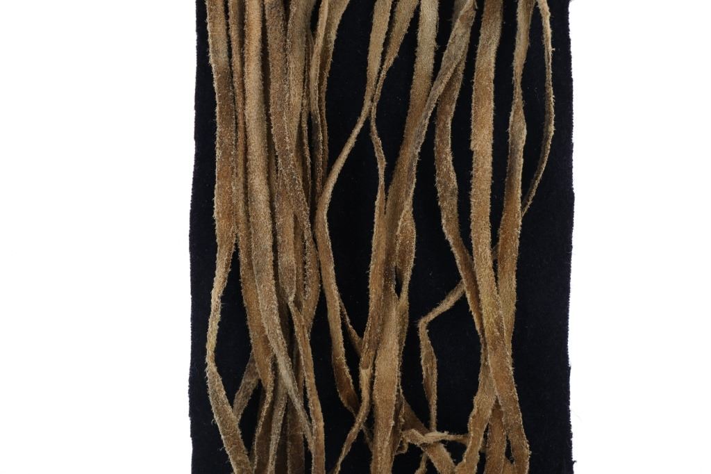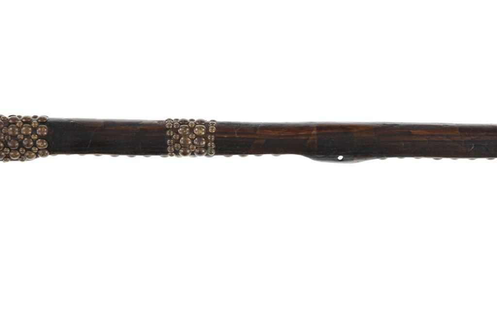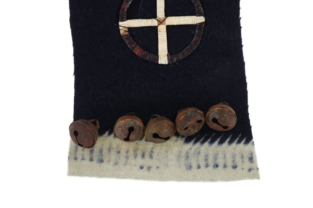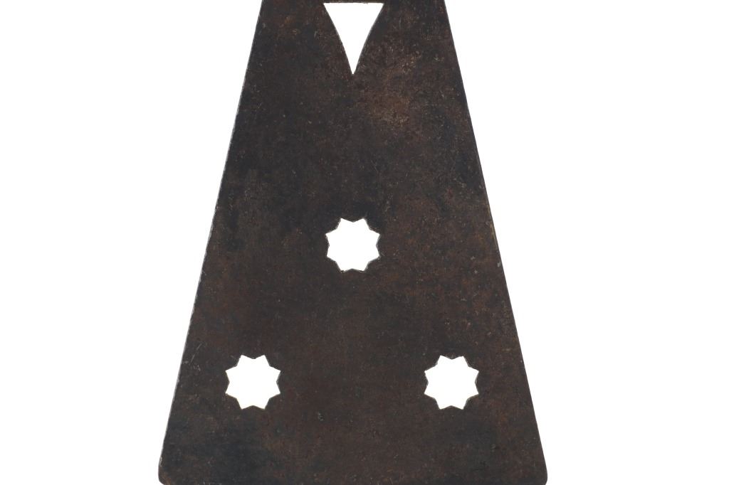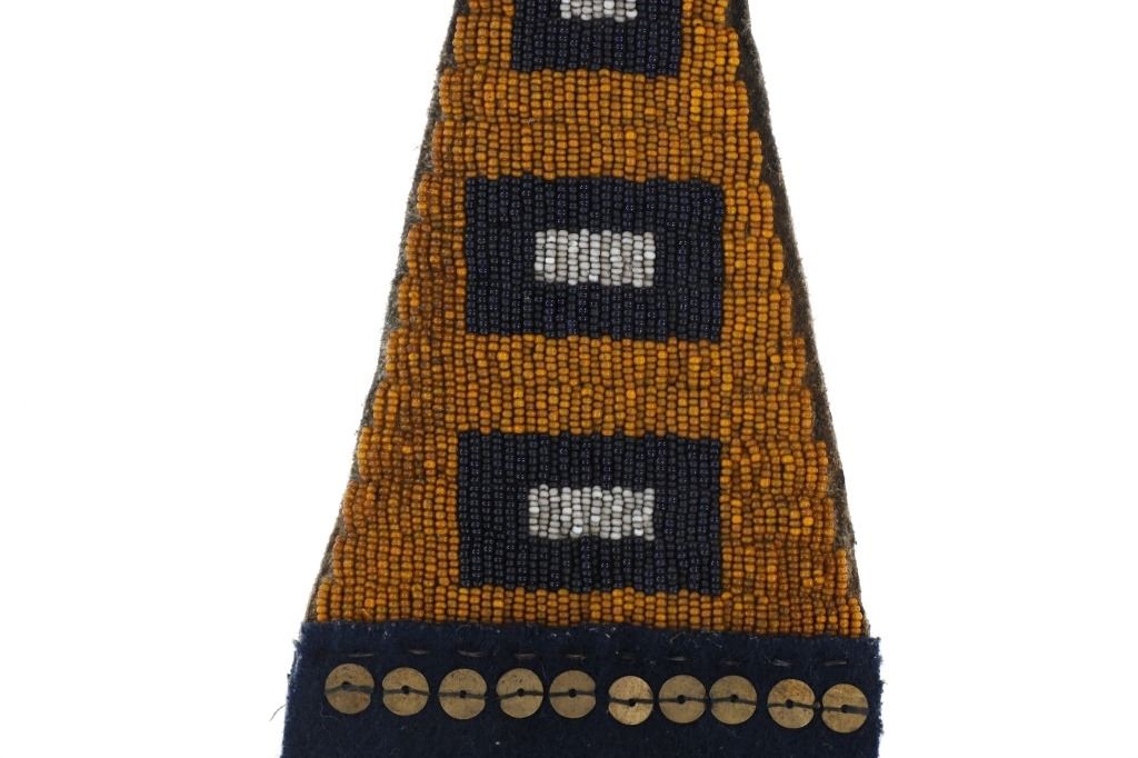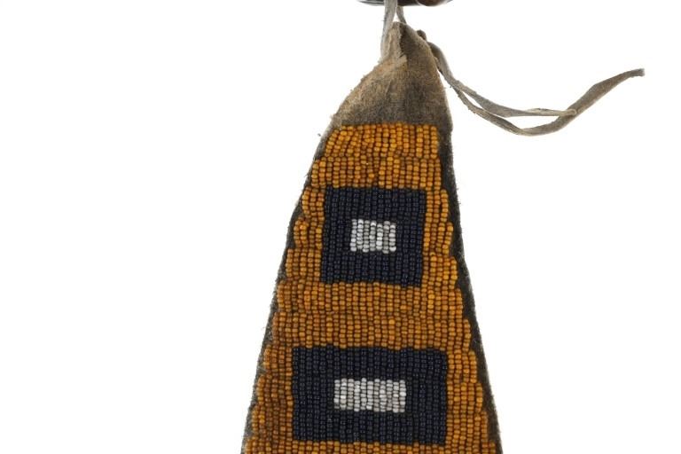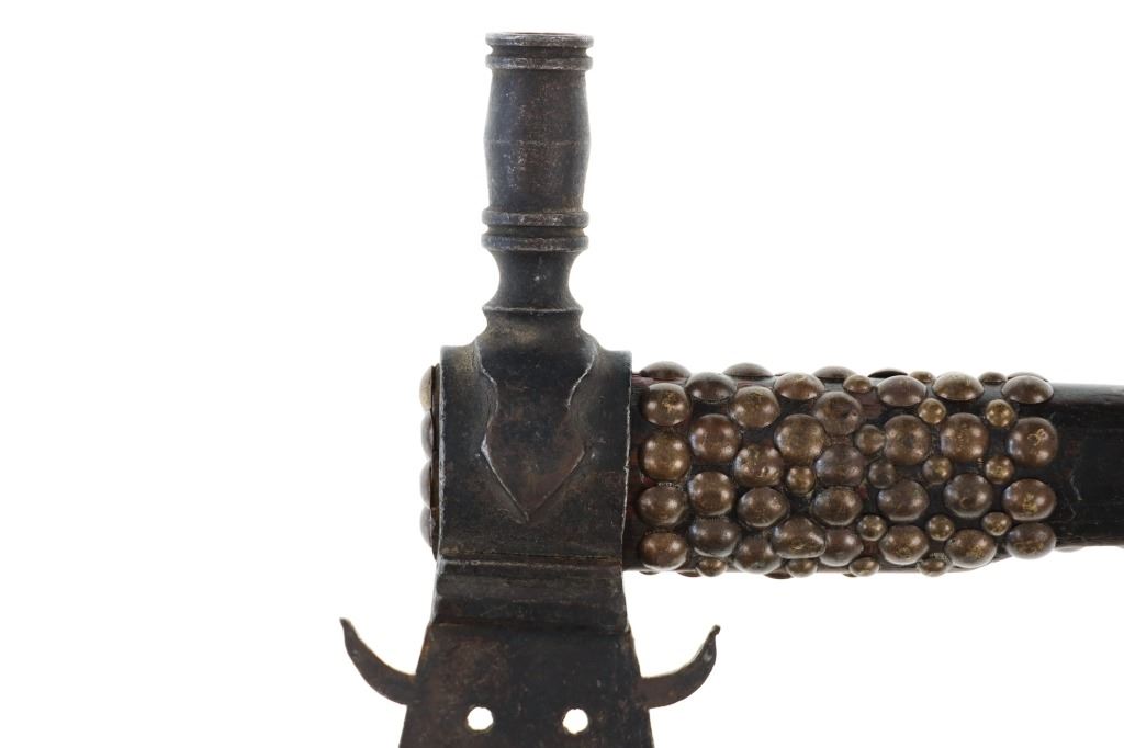 This is a large, western pattern pipe tomahawk with “Cave-Dweller” and eight-point star cutouts along with a beaded drop from the Northern Plains. The pipe tomahawk head shows a flaring large triangular typical western pattern blade with three eight-point star cutouts and atop of the blade two circles, triangle and crescent moon cutouts in the shape of a face with two upward curled spurs in the shape of horns. Also has a Buffalo / Bison like design. The eye is tear drop with large moldings and tall vase like bowl. The handle is soldi ash wood with hot file brandings, dark coloring and various brass and metal tackings. There is a drilled spot for a drop above and below the gripping area. The bottom has an Indian hide and trade clothe beaded and quilled drop. The drop shows glass trade beads in a classic tab design showing colors greasy yellow, chalk white, and cobalt. There are also brass disc beads, metal hawk bells and a rawhide parfleche wheel wrapped in porcupine quillwork in colors of blue and natural cream white. The tomahawk is from a Missouri private collection and displays wonderfully. Tomahawk itself measures 25.5-inches long with the head being 11.25-inches long and 4 3/8-inches long across the bottom of the blade. Drop itself is 26-inches long by 4.75-inches wide.
