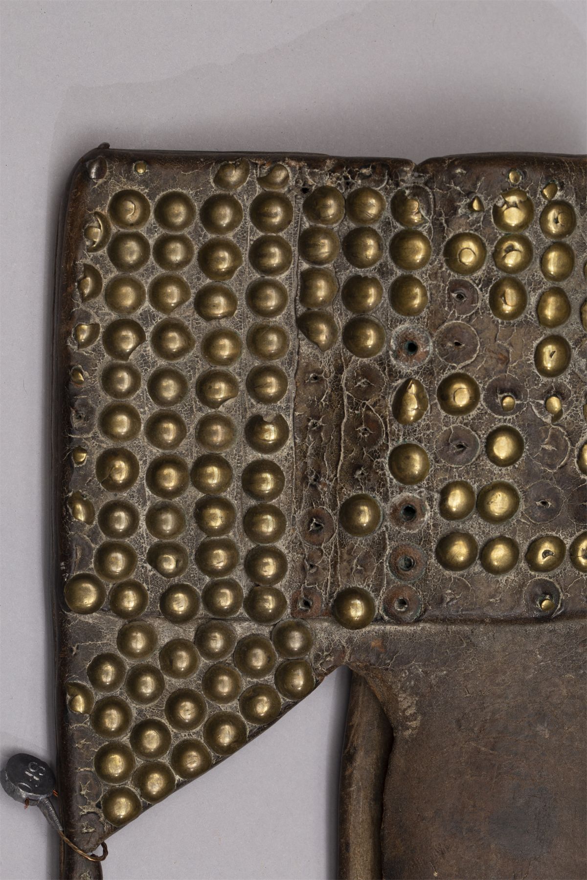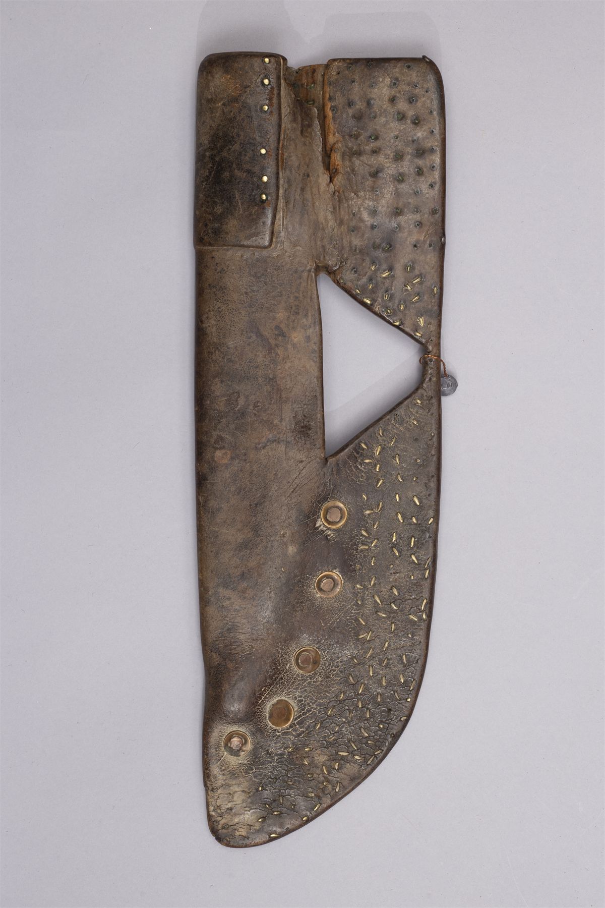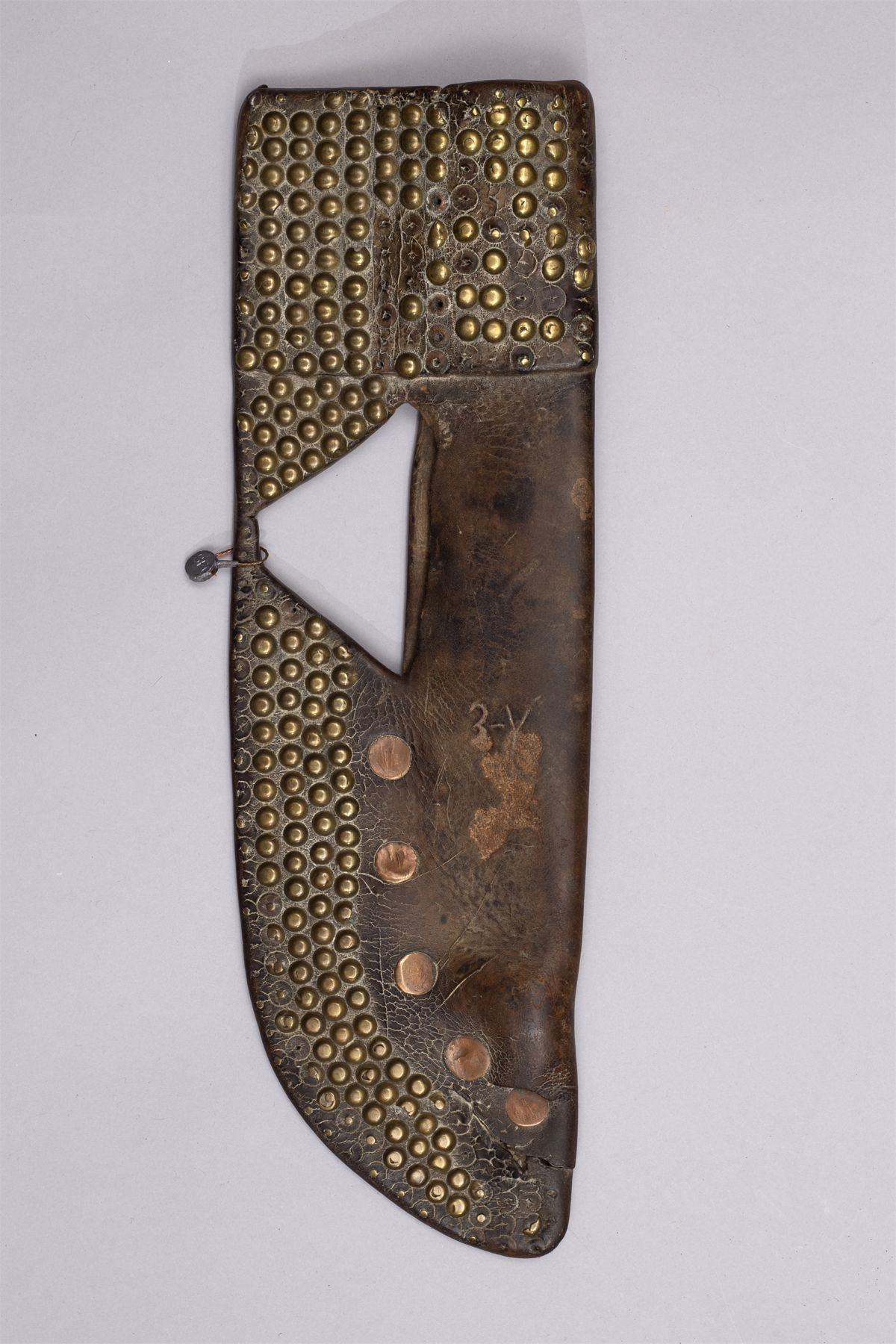 Large Northern Plains Knife Sheath, Ca. 1850-1875. Knife Sheath on commercial leather with large triangular belt cut out, carving "3-Y", adorn with over 200 tacks and 3 copper rivets.