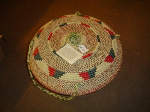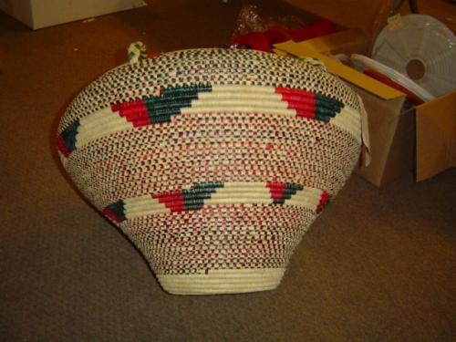 Nubian women began hundreds of years ago to weave baskets in Sudan from the reeds of the swampy area in which they lived. In the early 1900's some Nubian people migrated from southern Sudan to settle in Western Kenya. They continue making baskets, getting the reeds from the swampy areas of Kenya. The colors are made naturally by mixing the juice of the reeds with mud and leaving it to stand for two months. This beautiful basket is made by a Nubian women who lives in the outskirts of Nairobi, near a huge swamp where she gets the reeds. Traditionally these women do not work outside their home. They weave baskets at home as their only source of income. , This Kenya Nubian Food Storage Basket is 18"tall X 28" accross. Colors include red, deep green and natural. This basket has graced our store for several years, examined by many curious customers. The ropes that make up the handle on the lid, the inside ring under the lid and the nesting ring of the basket itself show some shop wear. It is still a beautiful basket, sure to enhance any home or business.