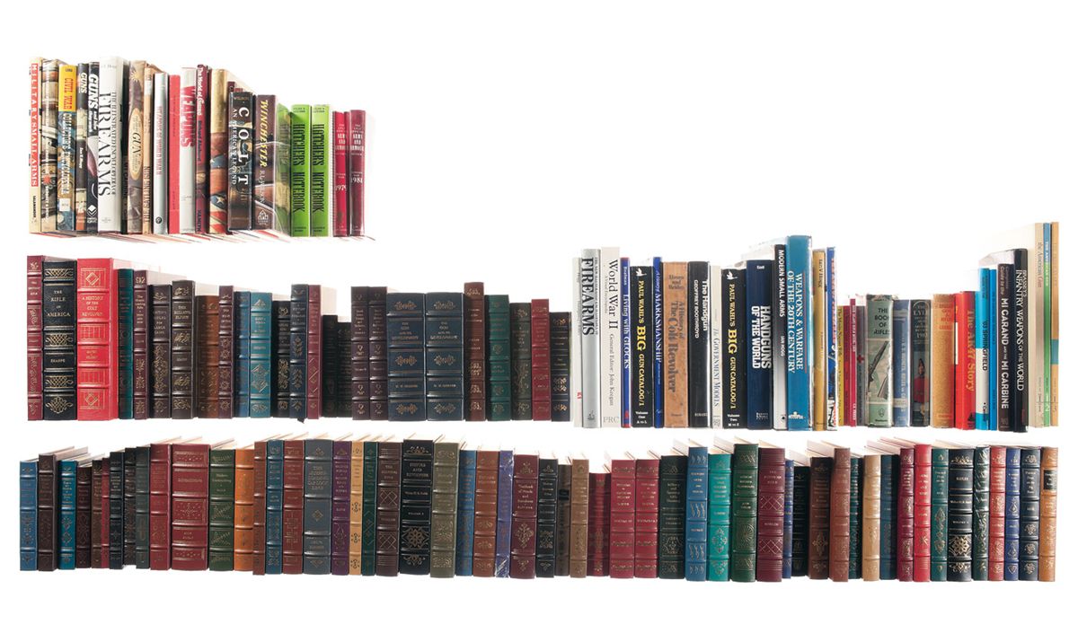 Approximately 134 books, 79 leather bound books from "The Firearms Classics Library" with several still in shrink wrap. Titles include "Big Game Rifles * Sixgun Cartridges and Loads" and "Keith's Rifles for Large Game" by Elmer Keith, "A History of Firearms" by Major H.B.C Pollard, "The Book of The Garand" by Julian S. Hatcher, "The Book of the Springfield" by Edward C. Crossman, "The Bullet's Flight" by F. W. Mann, "Shots Fired In Anger" by Lt. Col. John B. George and "The Ultimate in Rifle Precision" by Townsend Whelen. Approximately 55 books including "The Handgun" by Geoffrey Boothroyd, "A History of The Colt Revolver" by Haven and Belden, "The Identification of Firearms and Forensic Ballistics" by Major Sir Gerald Burrard, "A History of Marksmanship" by Charles Chenevix Trench, "Winchester An American Legend" by R.L. Wilson, "Colt An American Legend" by R.L. Wilson and "The Government Models" by William H.D. Goddard.