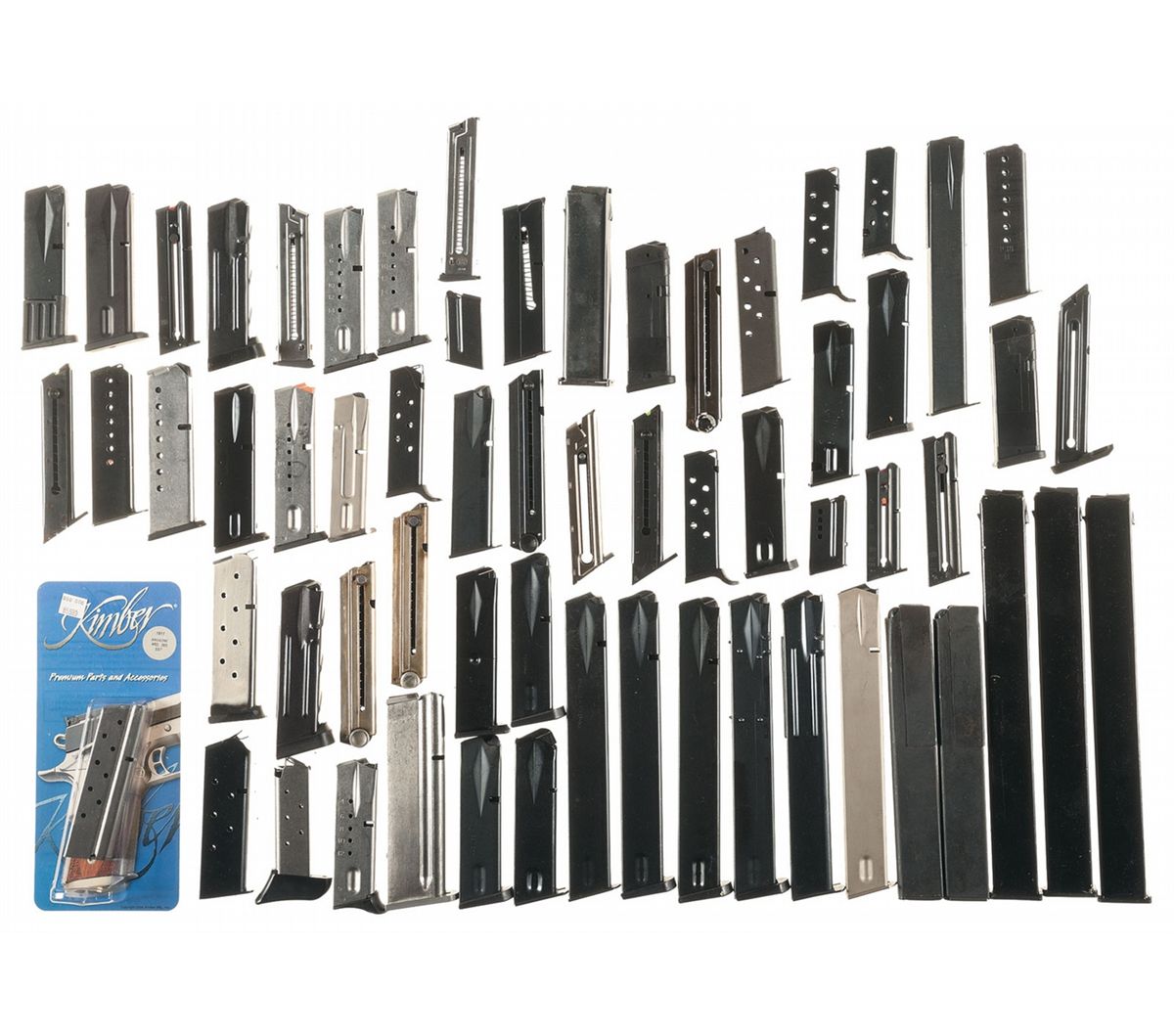 Approximately 100 various pistol magazines including Luger, Kimber, KG-99, S&W, Ruger with .22, 9mm, .38 calibers being represented.