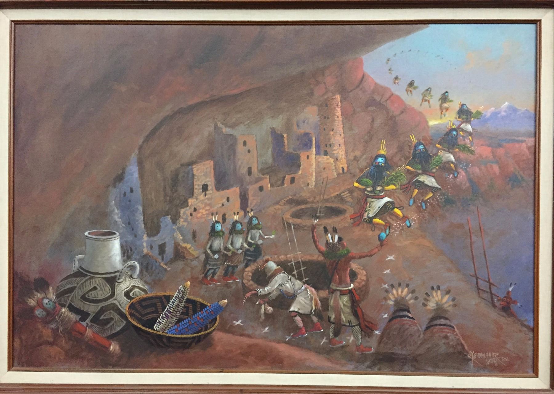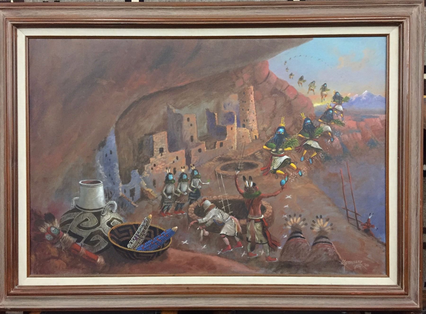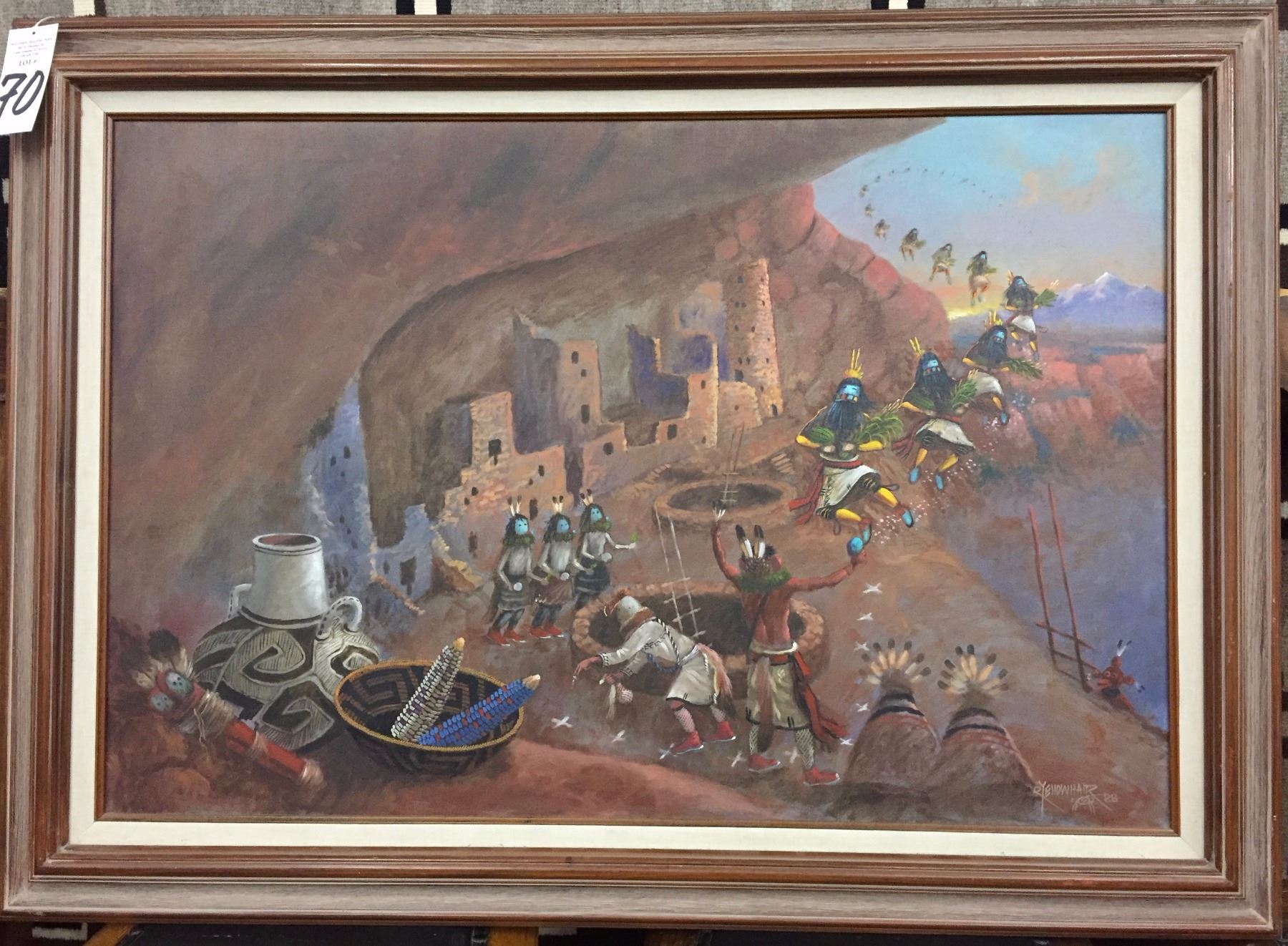 Description: A larger than normal and unique, original Robert Yellowhair oil painting. Maker: Robert Yellowhair. Approx. Age: Circa 1988. Size: Approx. 43” w x 31 5/8” l, including frame. Condition: Good for its age, normal wear expected. Please look closely at the pictures - they are an important part of our description. Shipping: There will be a $15 handling / packaging fee for shipping this lot. The actual cost of postage will be added on top of that.