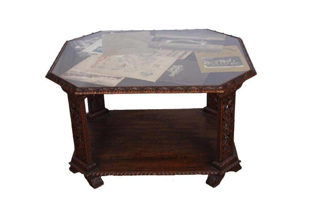 Large Oak Coffee Table Has pierced carved pillars, glass top with 1940s menu's. Measures 39 1/2"x31"