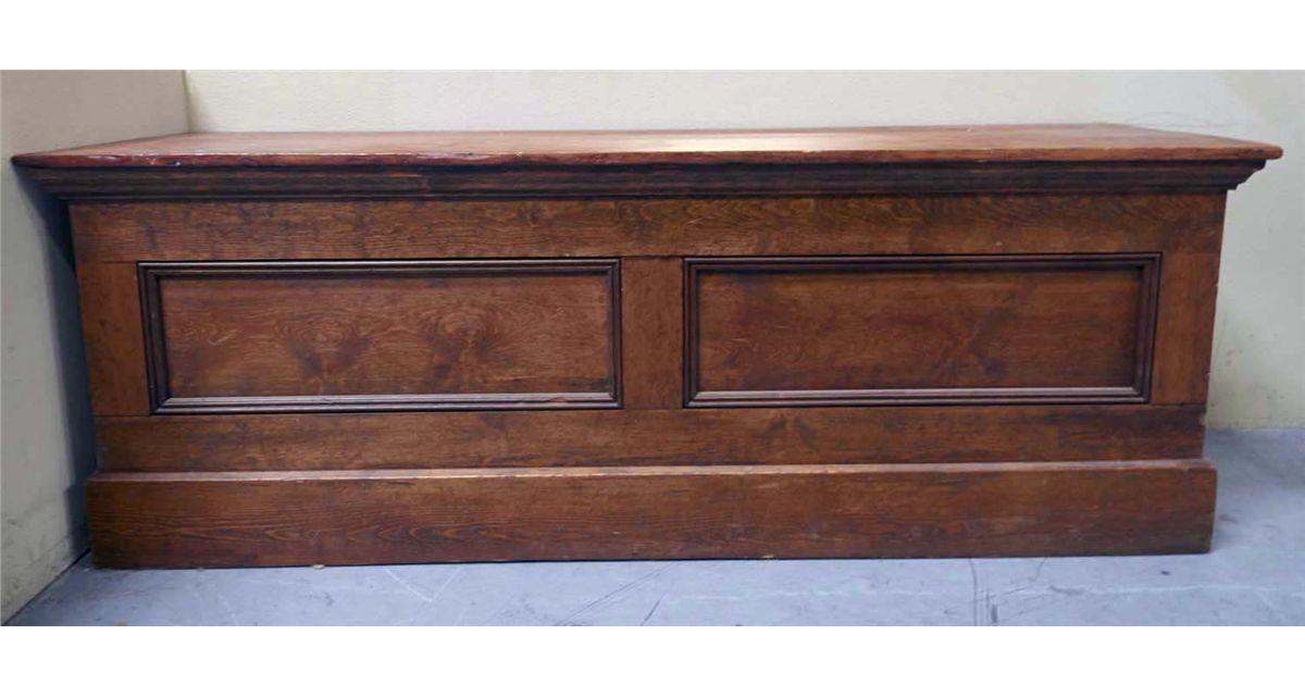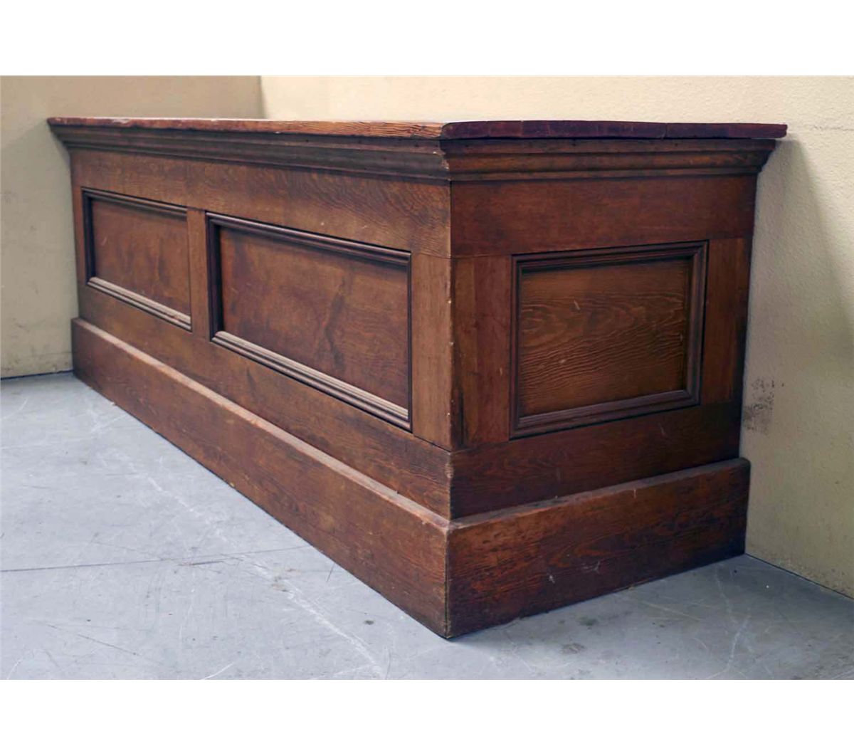 Large oak counter for country store. Sturdy and deep enough to support a shelving c1900s. Condition Excellent Size 83-1/4" x 26-1/4" x 29-3/4"