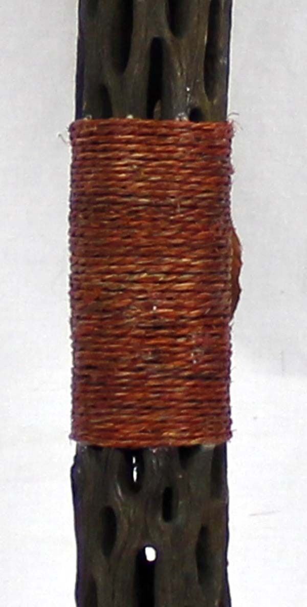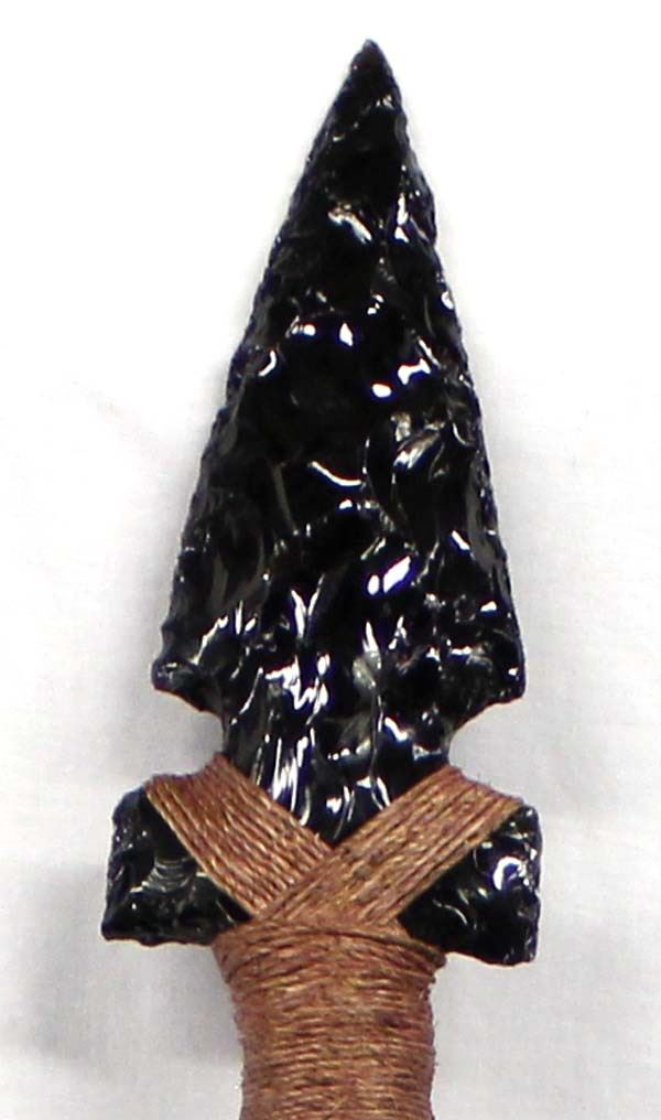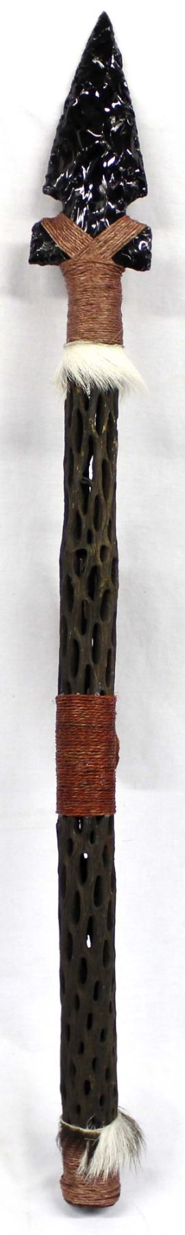 Large Lance, features huge obsidian spearpoint on cholla cactus shaft, shaft is embellished with fur, yarn, and large single feather, the large obsidian spearpoint measures 8.5''L x 4''W (at widest point), overall length of 38'', gorgeous obsidian