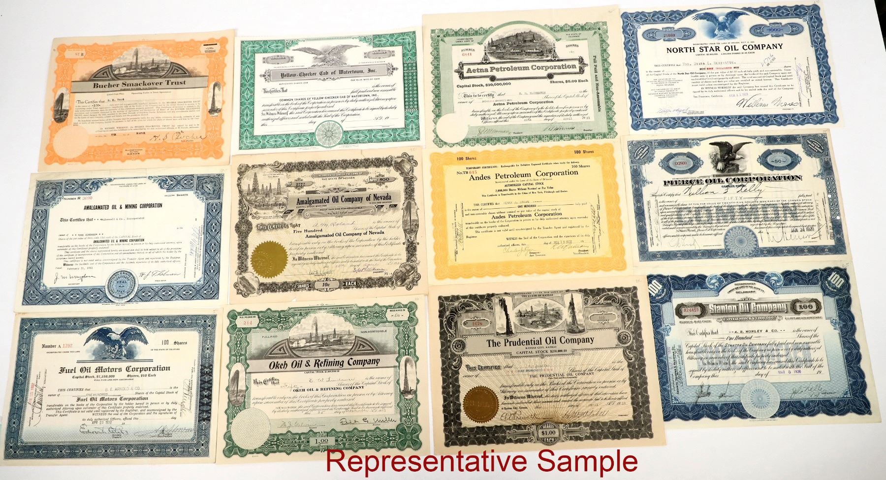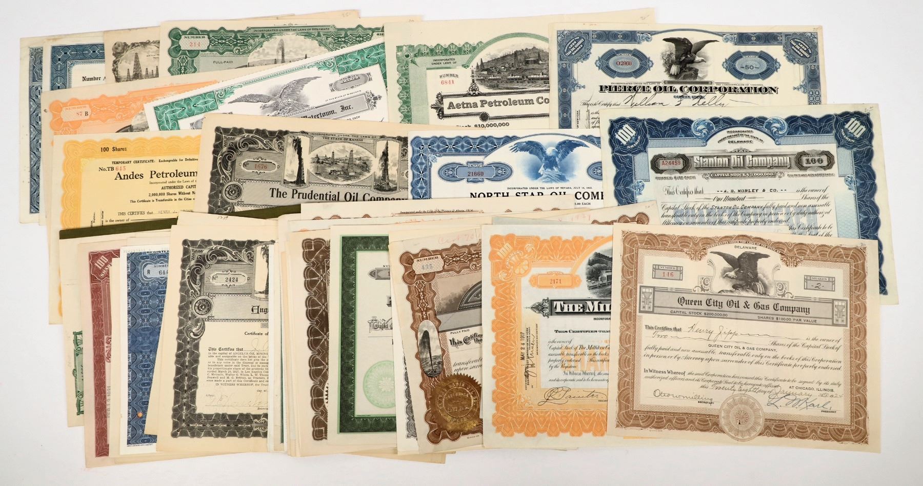 Approx. 25 plus. U/U. I/C, I/U. Issued 1865-1929. Some with revenue stamps and great vignettes. I.E.; Tionesta and Sugar Creek Oil Co., Gulf Oil Co. , The Amber Petroleum Co. , Petaluma Oil & Burner Co. , Angeles Oil Mining Assoc. and more.