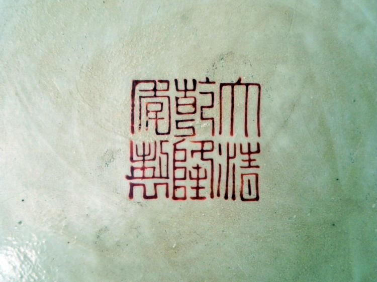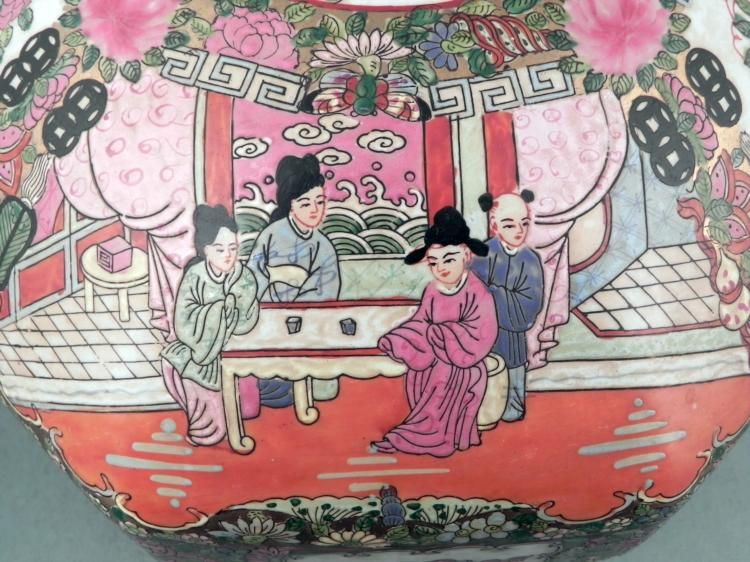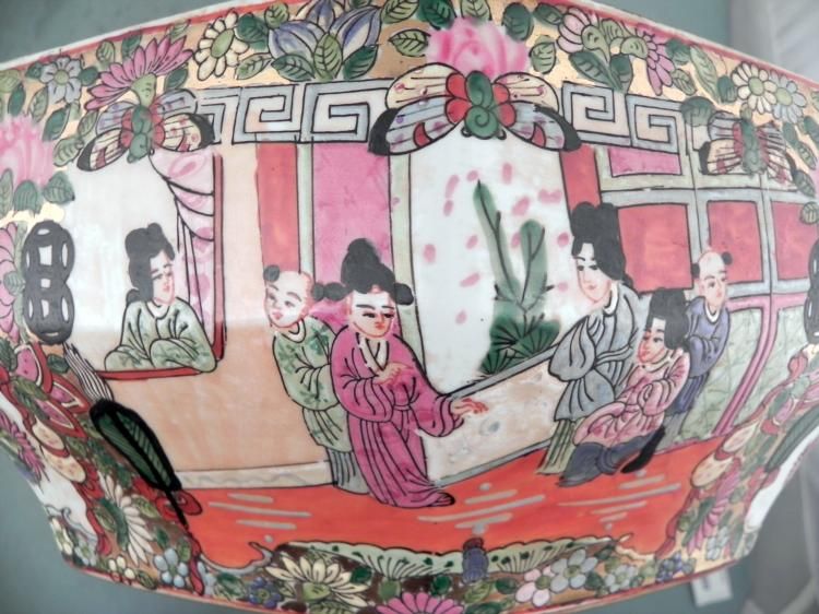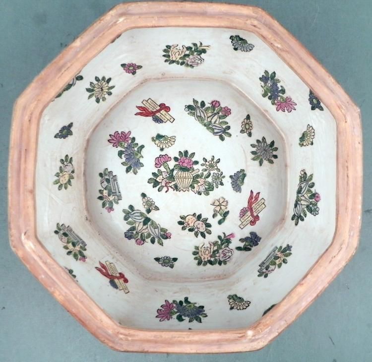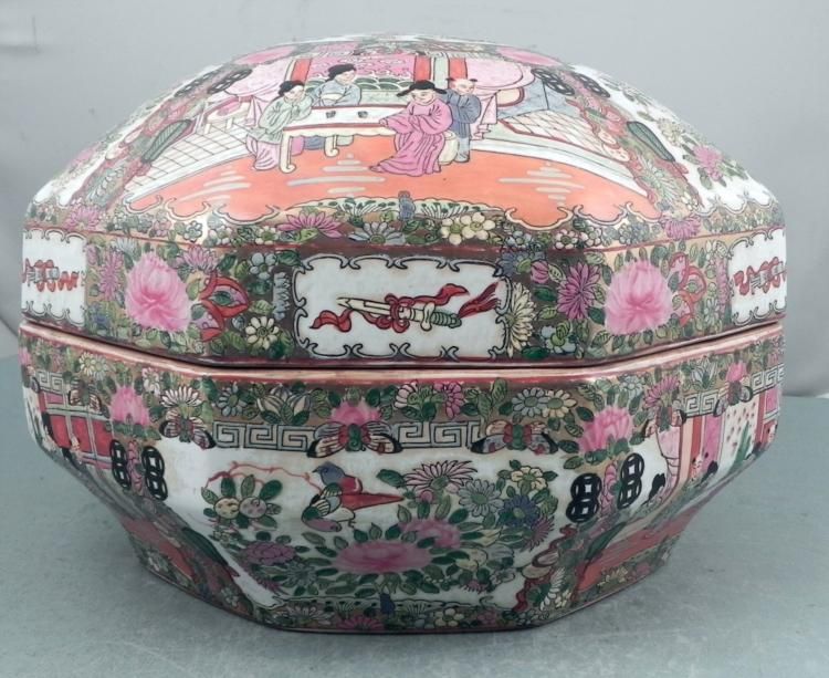 This is a large lidded Chinese box in an octagonal shape, adorned all around with beautiful painted scenery and ornamentation. There are figures in traditional garb, swords, birds, flowers, and moths, with edges in gold. The inside lower section is also * decorated. The dimensions are 14" in diameter and 10" high. The underside is marked with a Chinese character. The condition is very good, with some staining visible on the white portions (we have not attempted to clean it). * * * This is a nice piece in a large and unusual form, perfect for anyone who loves oriental antiques.