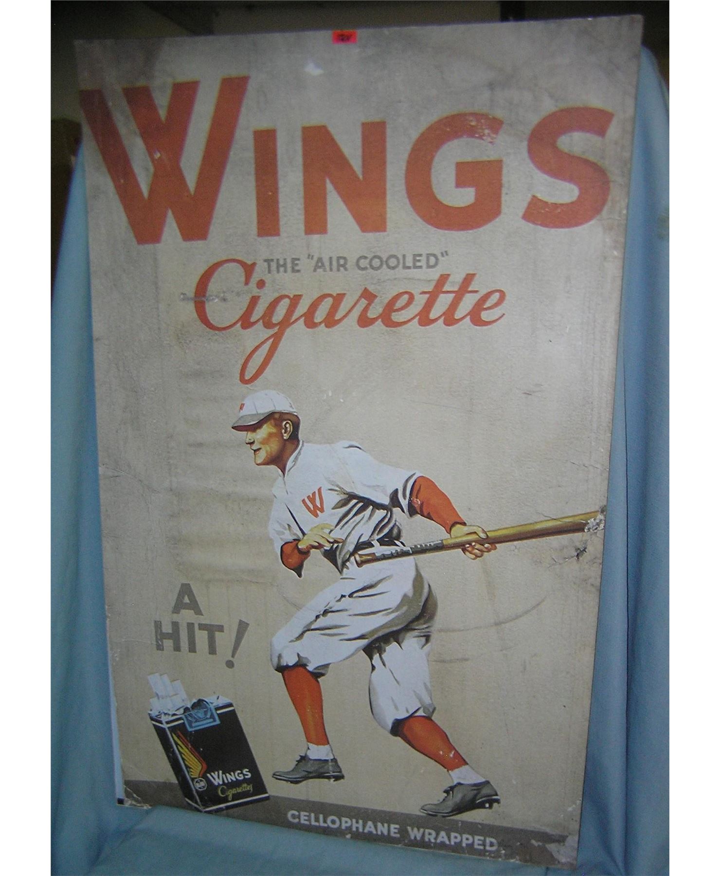 Wings cigarette baseball player themed retro style advertising sgn 2 feet wide by 3 feet high mounted on masonite est. value $500.00-$600.00