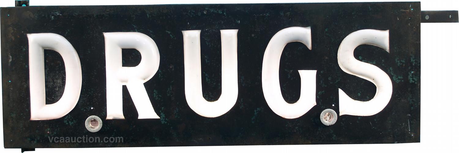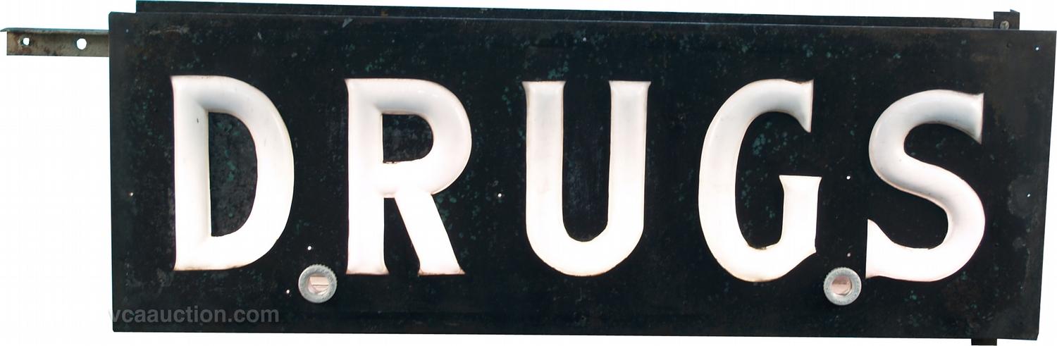 Large Old Metal Outdoor Light-Up Double Sided "DRUGS" Trade Sign, works, no broken milk glass letters - 50" x 17"