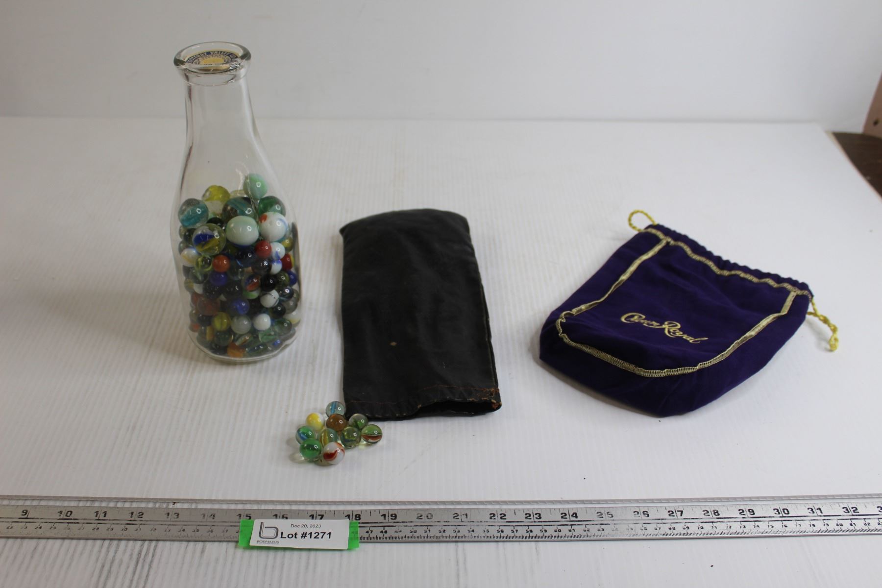 Large Old Milk Bottle of Marbles, Old Leather Marble Bag with Marbles