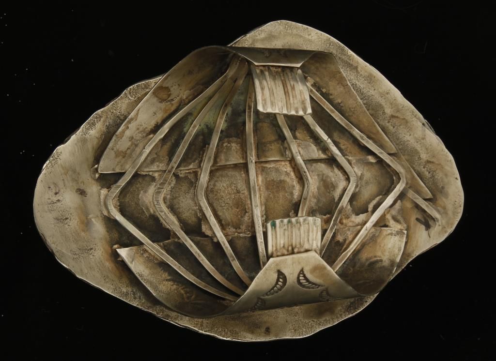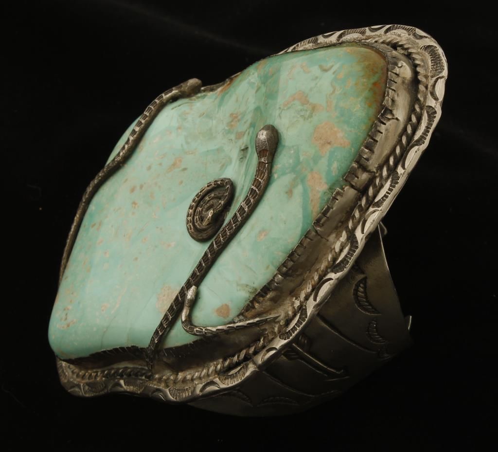 Large green turquoise stone, set in sterling silver, with snakes accenting the turquoise. Large piece, the turquoise stone measures approx 4-1/4" x 3". The inside measurement is approx 2-5/8" across with 1-1/4" gap. Unique design.