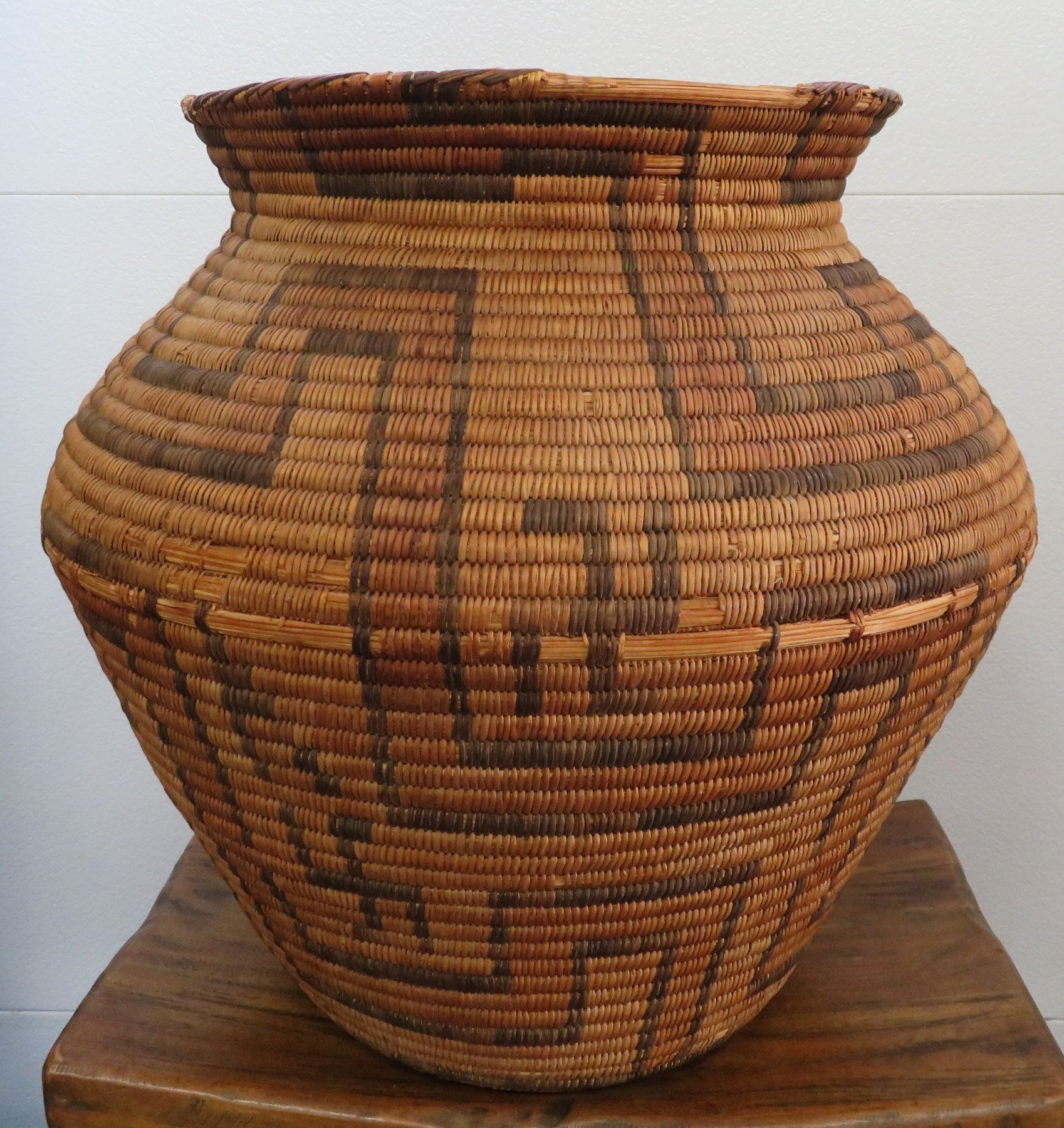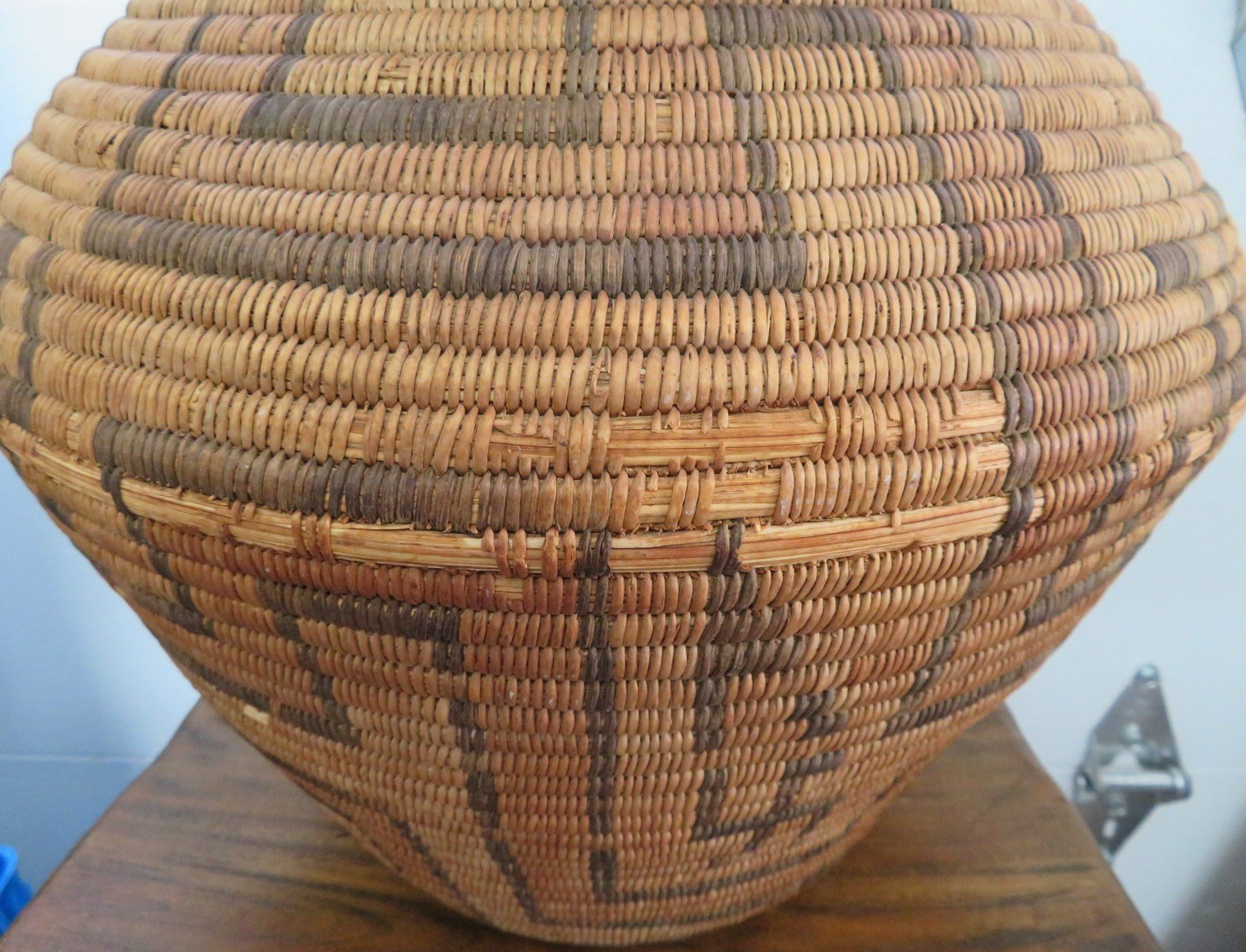 Large Old Polychrome Pima Olla, c. 1920s. Made of willow, devil's claw and grass, the item measures 15" x 15". Phoenix, Arizona. Condition: Rim and shoulder damage, see images. Shipping: $65.00 USA estimate only, due to size and value.