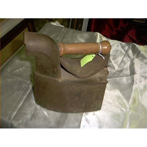 Large Old Steam Iron Stamped "M". This has a nice old wooden handle and has the letter "M" stamped on it. Real nice old Vintage one and in really nice condition for it's age. It is 8" H X 8.5" L X 4.5" W. the photos show you how nice looking it is. Has that great antique look to it, and it shows it's age, but still looks great. Hope you like it. Great add to any collection you may have.