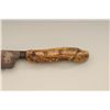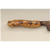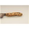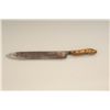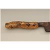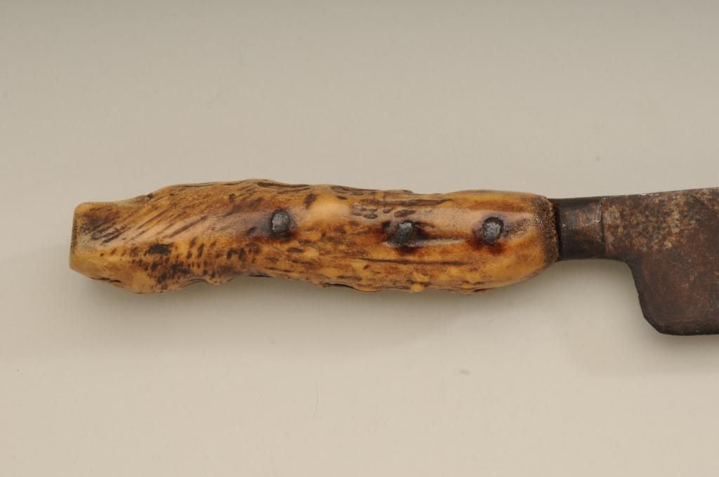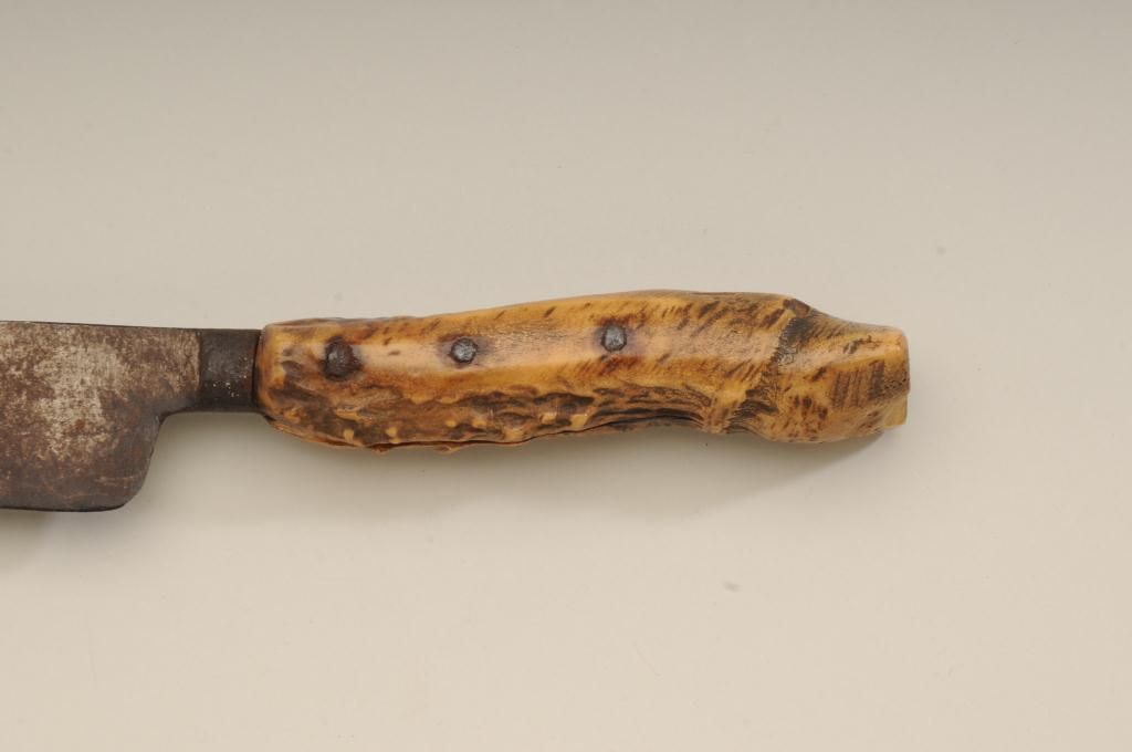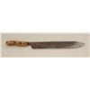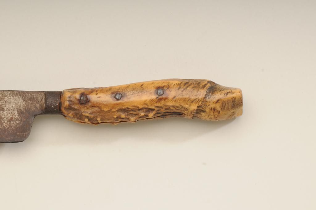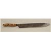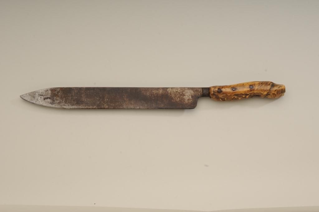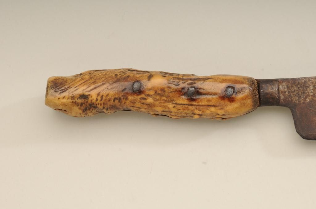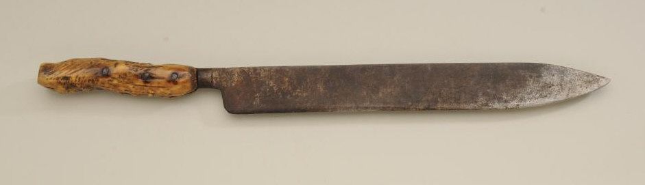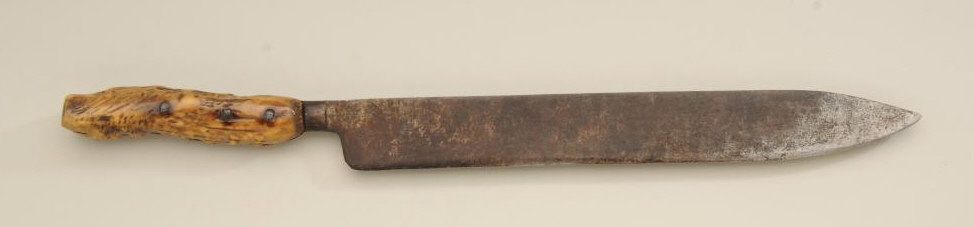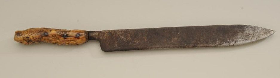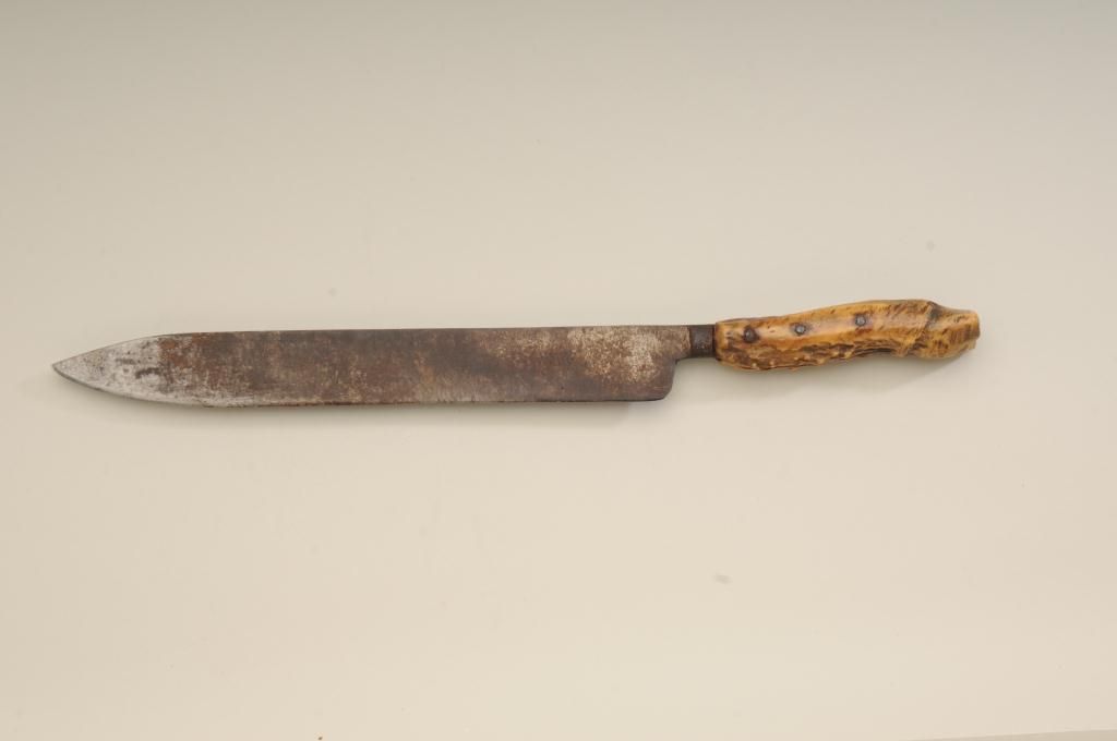 Large Old West skinner’s knife , Sheffield-marked, approx. 20” overall with a massive 14” blade showing a heavy dark brown patina and well-worn three-pinned stag handle; would go great with a Sharps rifle or buffalo hunter’s display. Est.: $150-$300.