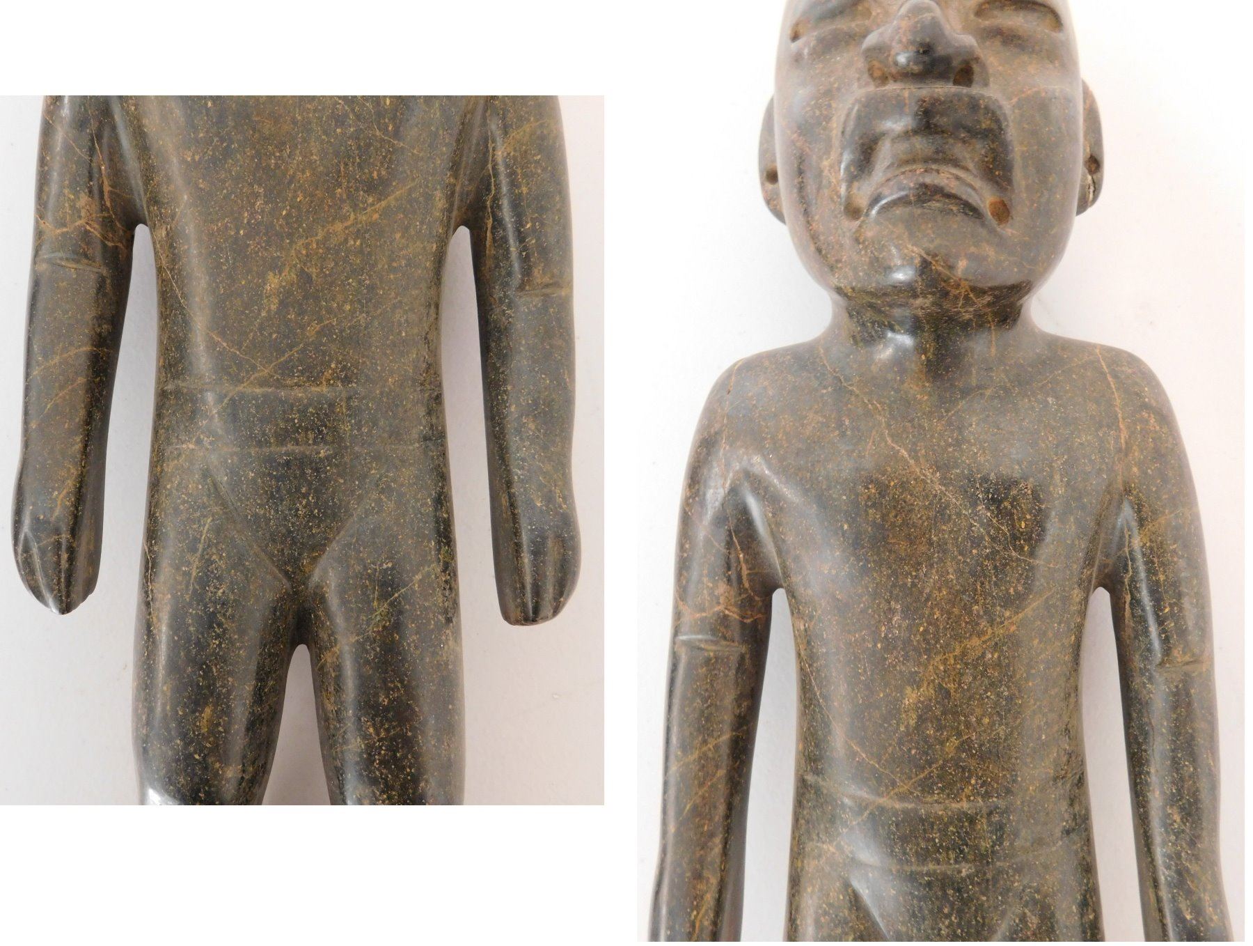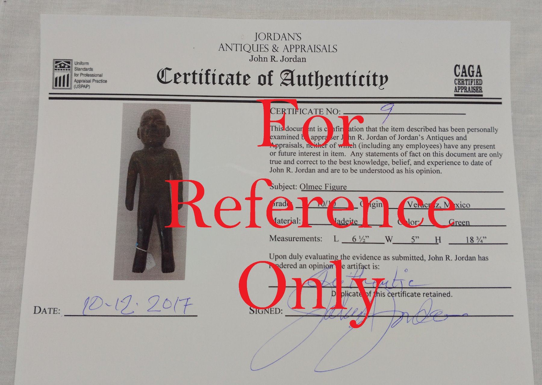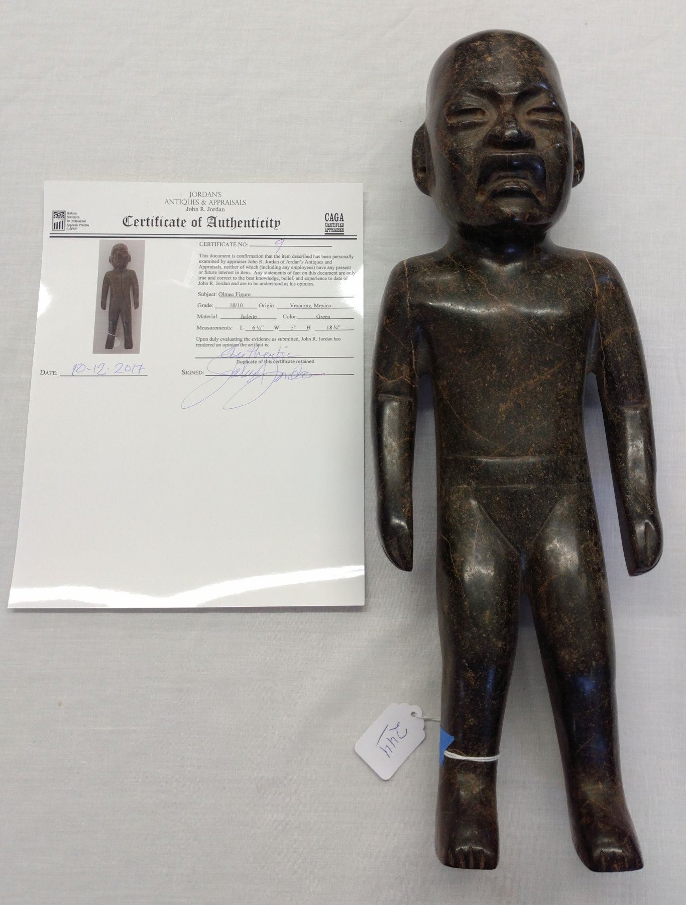 Large Olmec Figure w/John Jordan COA, pre-Columbian item. Made of jadeite, the item measures 6 1/2" x 5" x 18 3/4". Veracruz, Mexico. Has ancient cracks. Transformation-style mouth. From an old, 1960s California collection. John R. Jordan Certificate of Authenticity. Condition: Good, as found, see images. Shipping: $80.00 USA estimate only, USPS Registered Mail, w/insurance and signature, double-boxed.