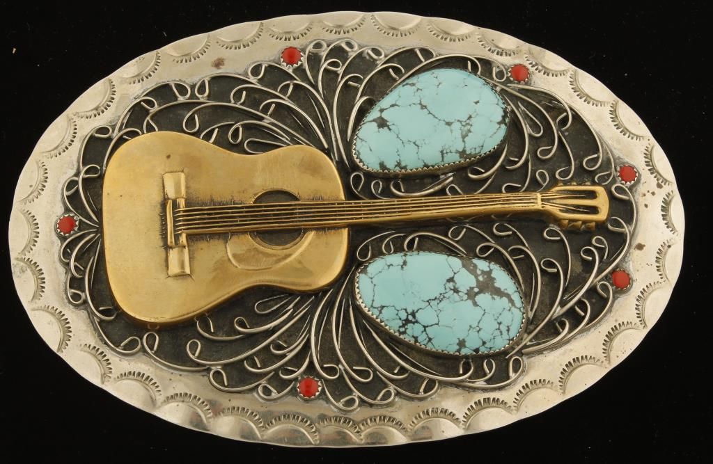 Sterling silver with guitar design turquoise and coral inlaid. Hallmarked with image of frog. Circa 1950's. Approx 6" wide x 4" tall.