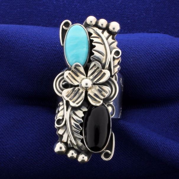 The ring is 1-3/4" long (big ring!) with excellent quality. Size 9. Navajo style. 16.8g