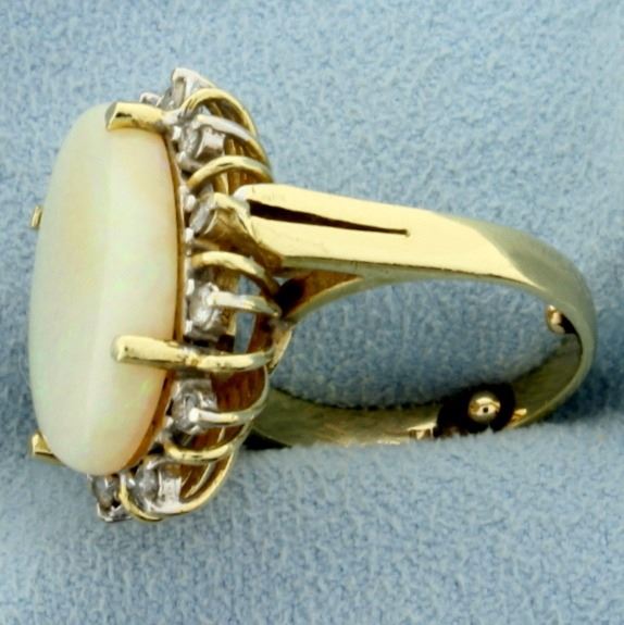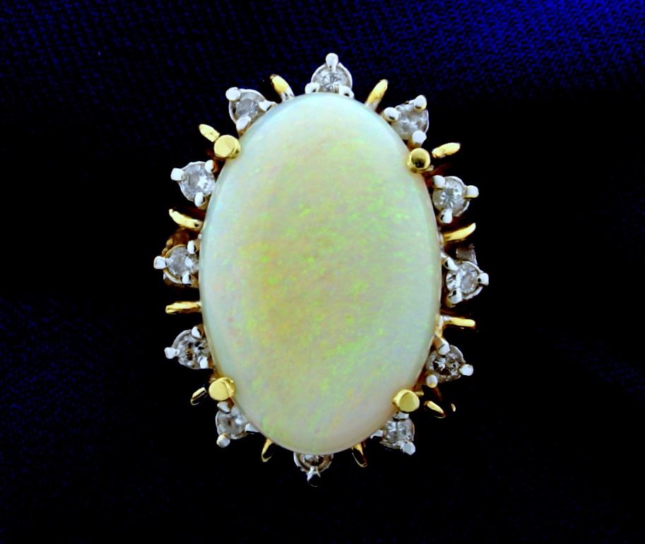 In 14K yellow gold. The center is a 20x13mm oval opal with excellent play of color. Surrounded by twelve .03ct round diamonds, for a total weight of .36cts. Size 7, this ring has stabilizing balls        7.9g