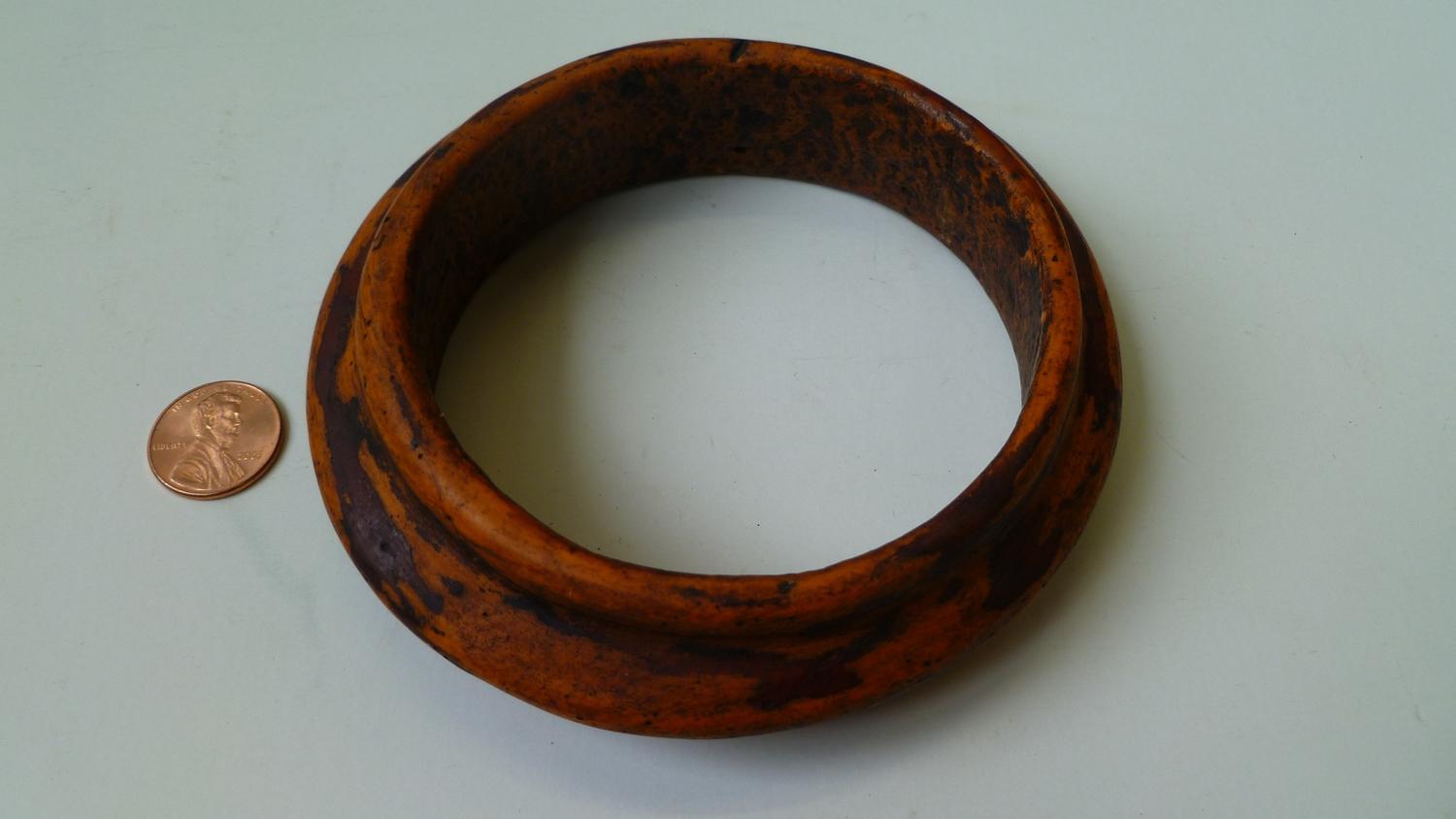 Found in Java, this impressive example of early Indonesian glass-making dates to the 1st millenium AD also (and may be Srivijaya-culture). It is among the largest I have seen, and also about as fine a condition as is known. Many centuries later they were traded to Palau and other South Seas islands where they became high-status goods and trade currency - so much so that by the 19th C. even small pieces were holed and worn as amulets and used in bride-price bartering on Palau (SEE: The research of Charles Opitz). Good orange color, fully intact and essentially perfect, this also has tightly-bound patination in parts that I have not tried to remove. Highly Important artifact with a 3-1/16" I.D., it had to be for a high Chieftain at the time.