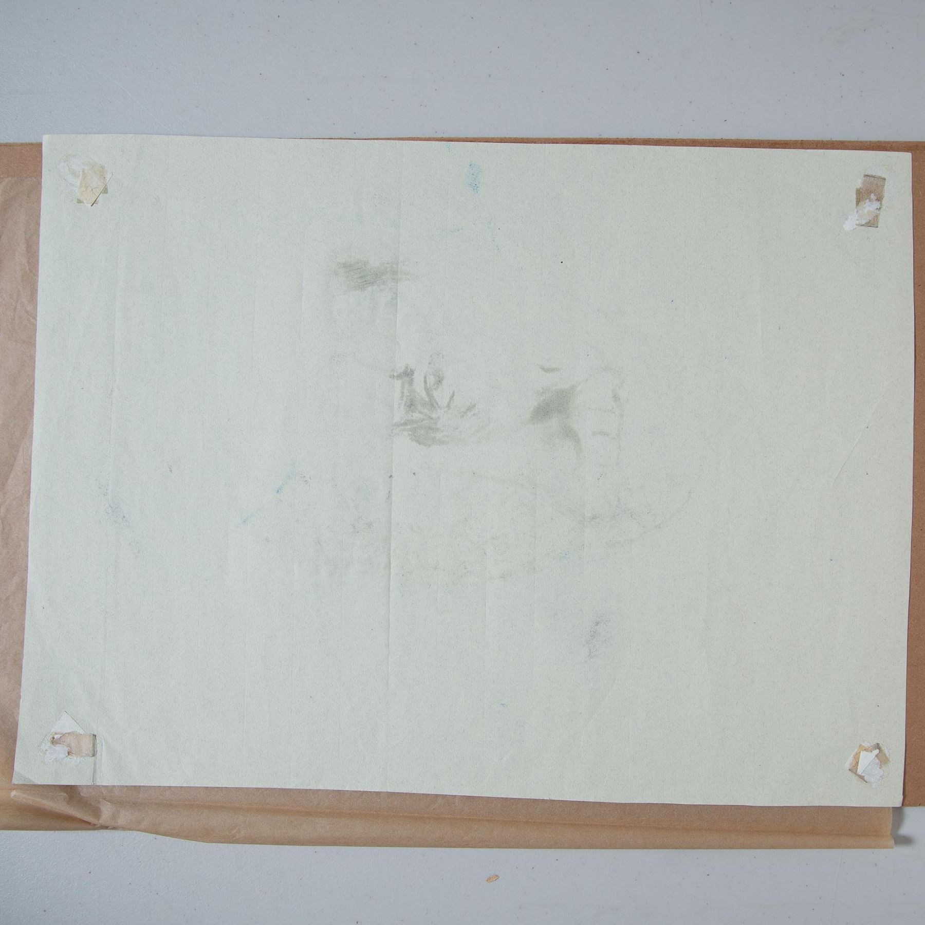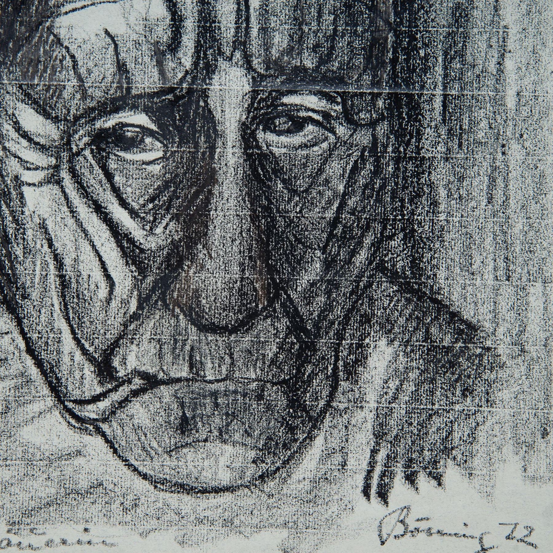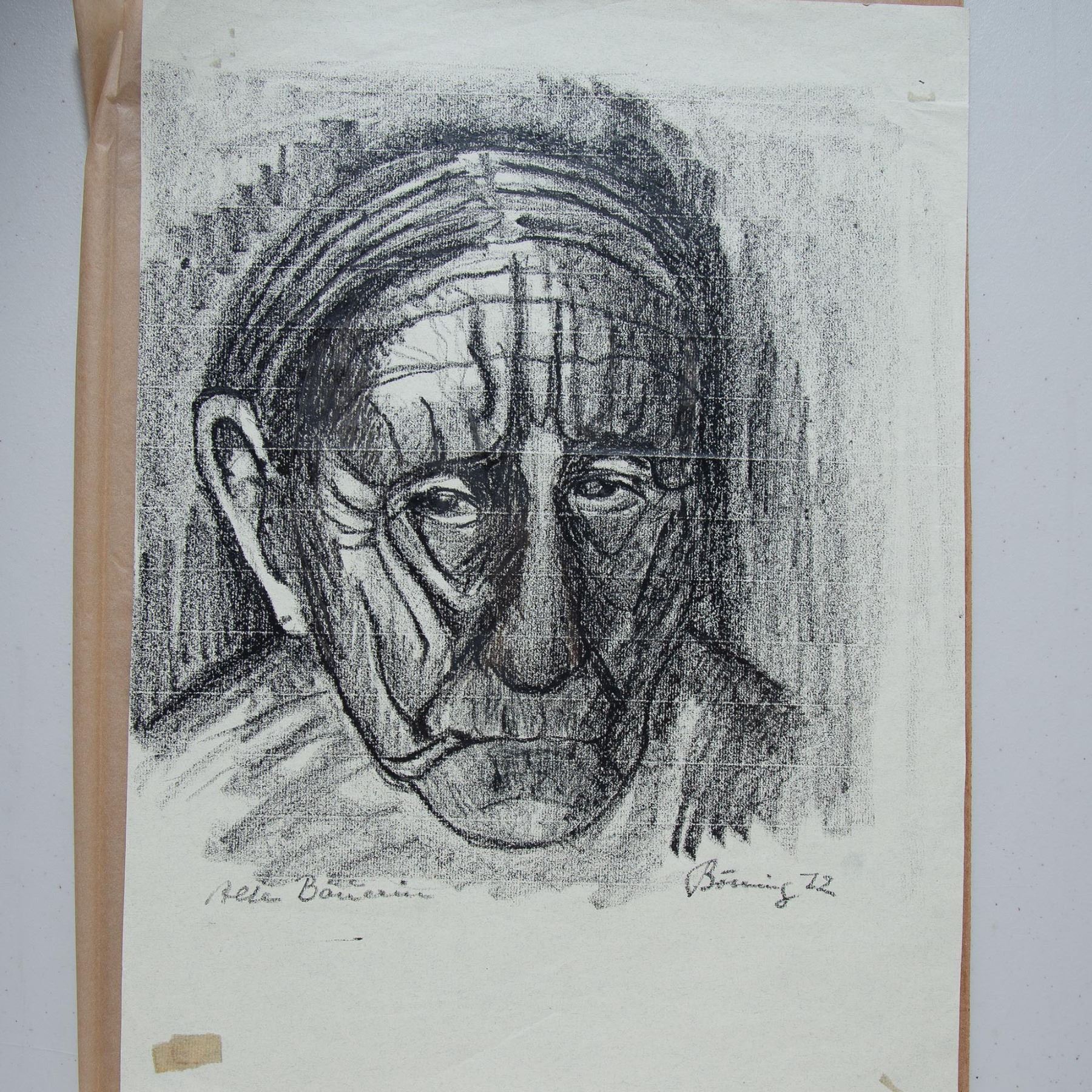 Large original pastel drawing on paper made in a German Expressionist style. It portrays an old weathered woman made of lines that the artist has deeply carved in her face. Signature, title and date: illegible, 72.