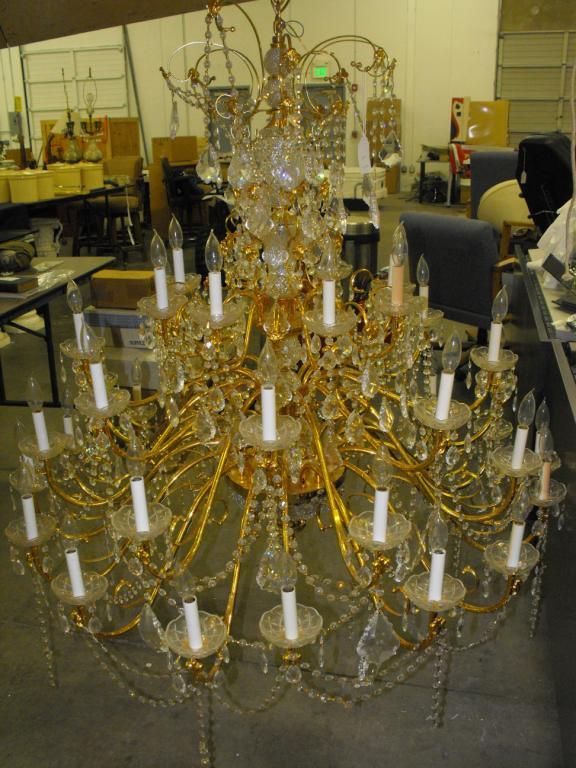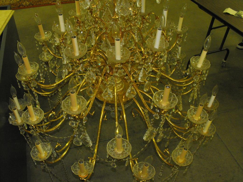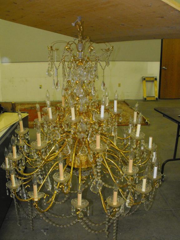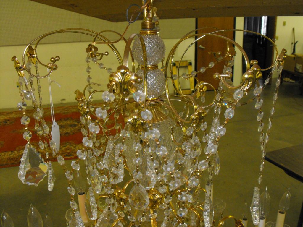 Very Ornate vintage entry way chandelier with large crystal pendent hangings. With brass arms and body with glass globes throughout body. With candlestick lights, in good condition. 4' in diameter 4' tall.