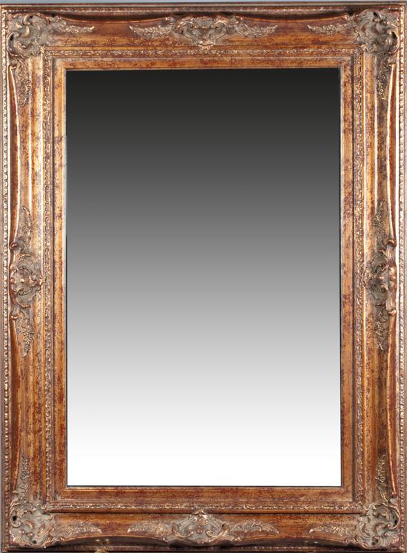 Gilt frame with decorative scrolling and leaf designs, housing a beveled mirror. 47" H x 34.5" W (can also be hung horizontally). Excellent condition.