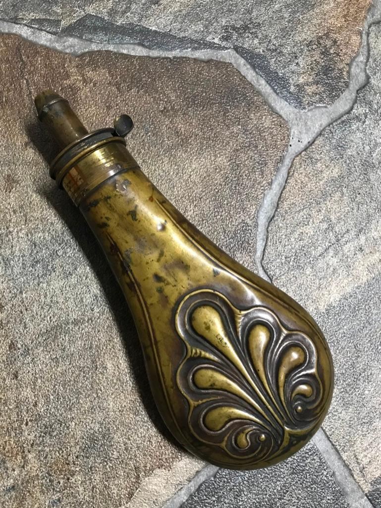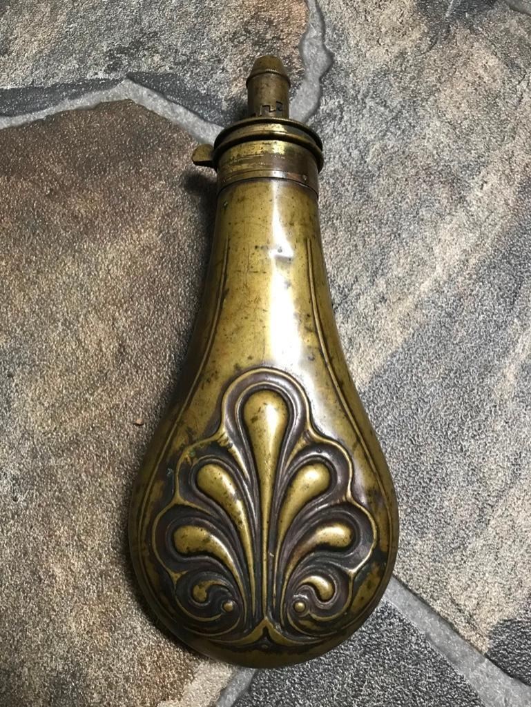 19th Century ornate design copper & brass powder flask. Large size 8" L X 3 1/2" W.Â