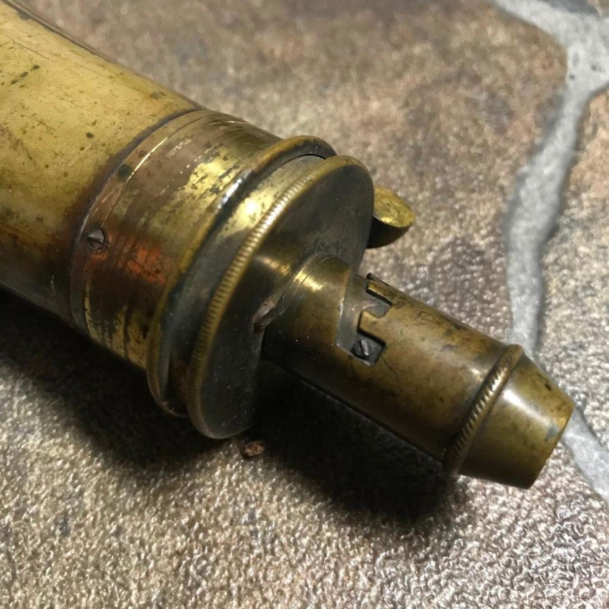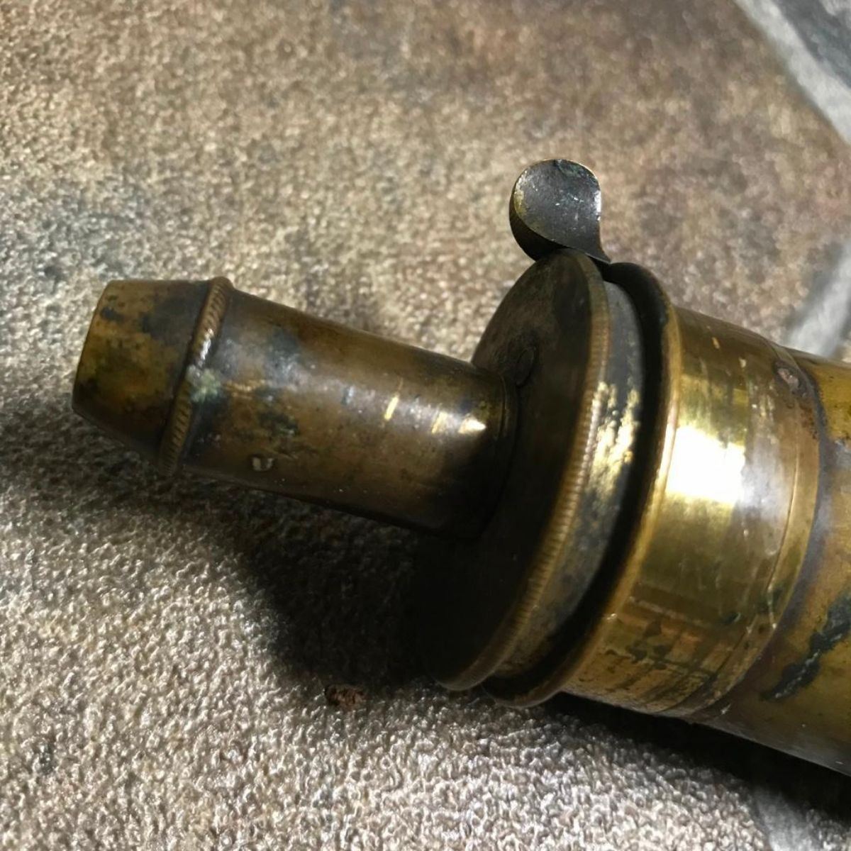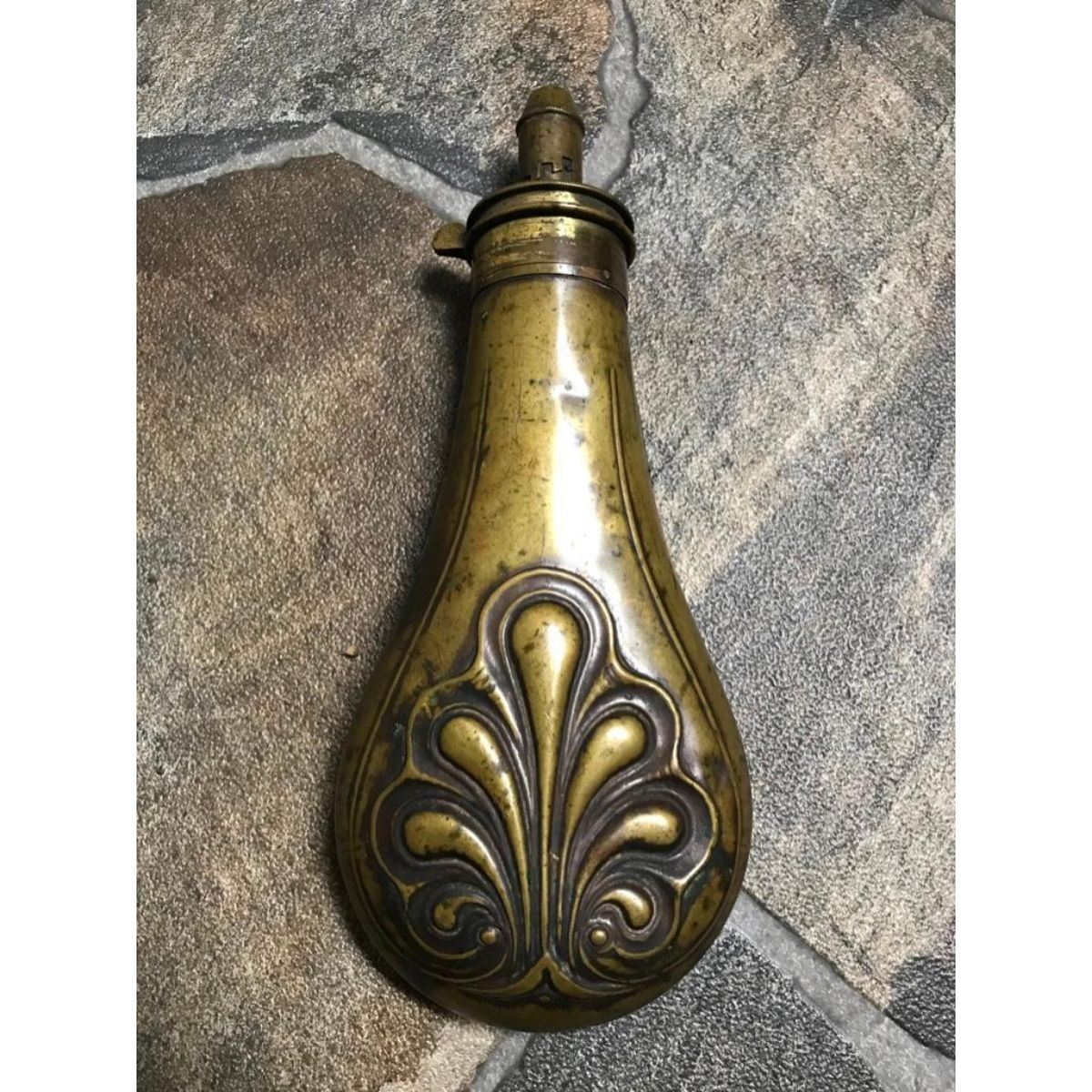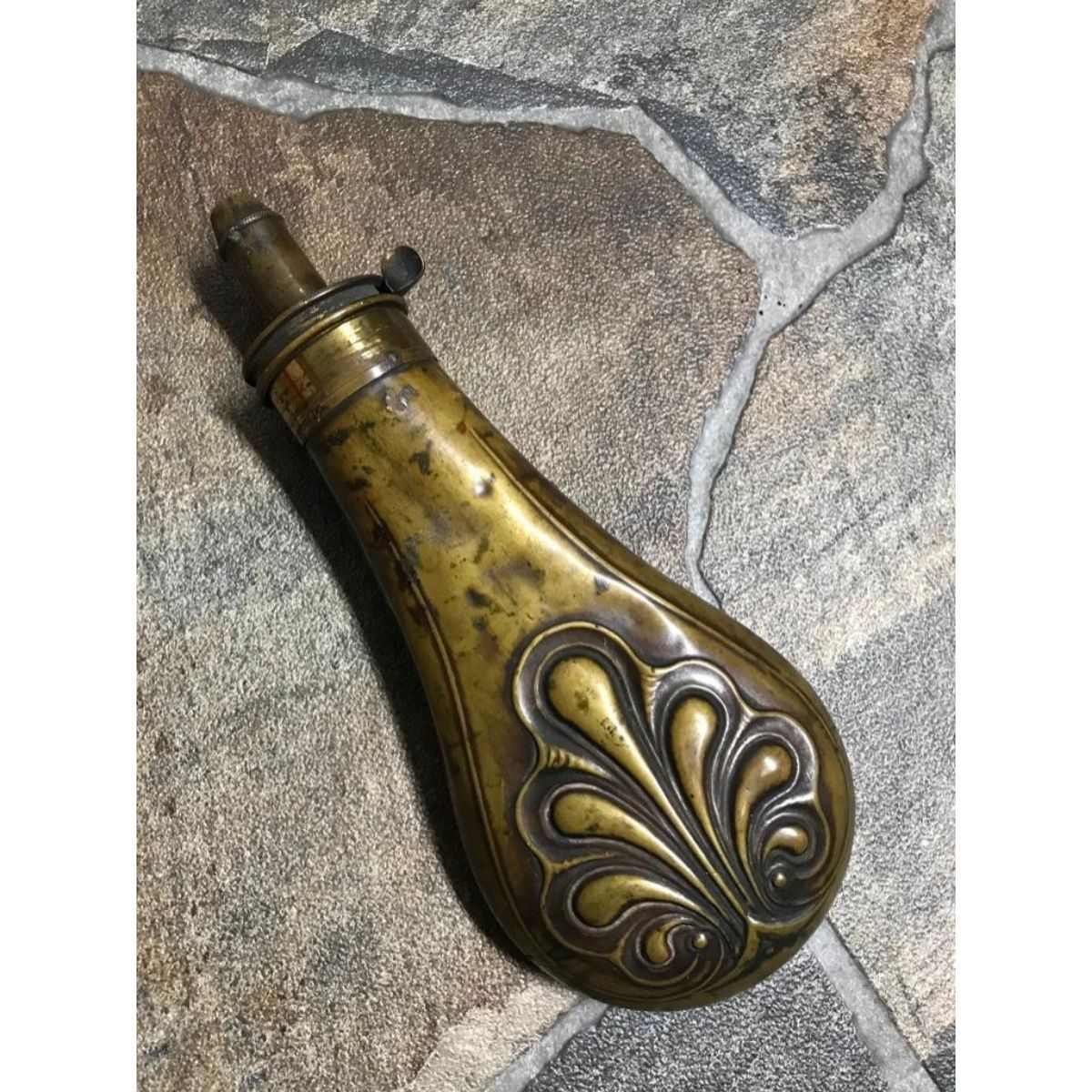 19th Century ornate design copper & brass powder flask. Large size 8" L X 3 1/2" W.Â