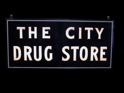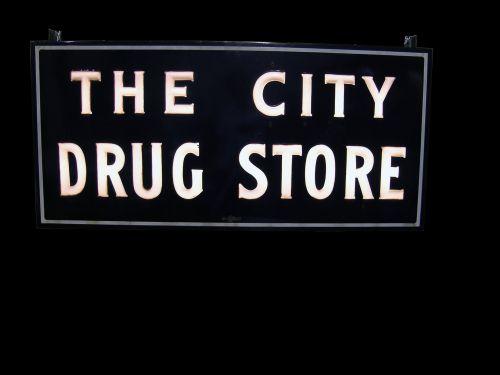 Large, "Outdoor" Neon Sign, porcelain & glass, 2 sided "City Drug Store" by Flexlume Co. 28 x 60" letters are glass lights up from the inside works