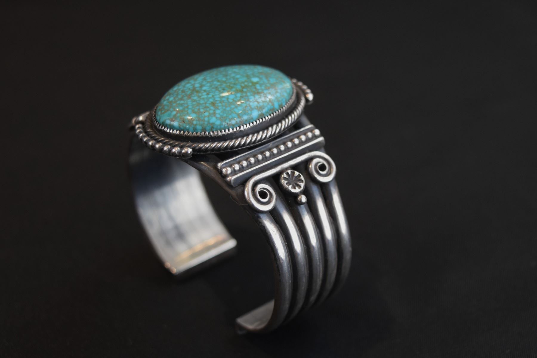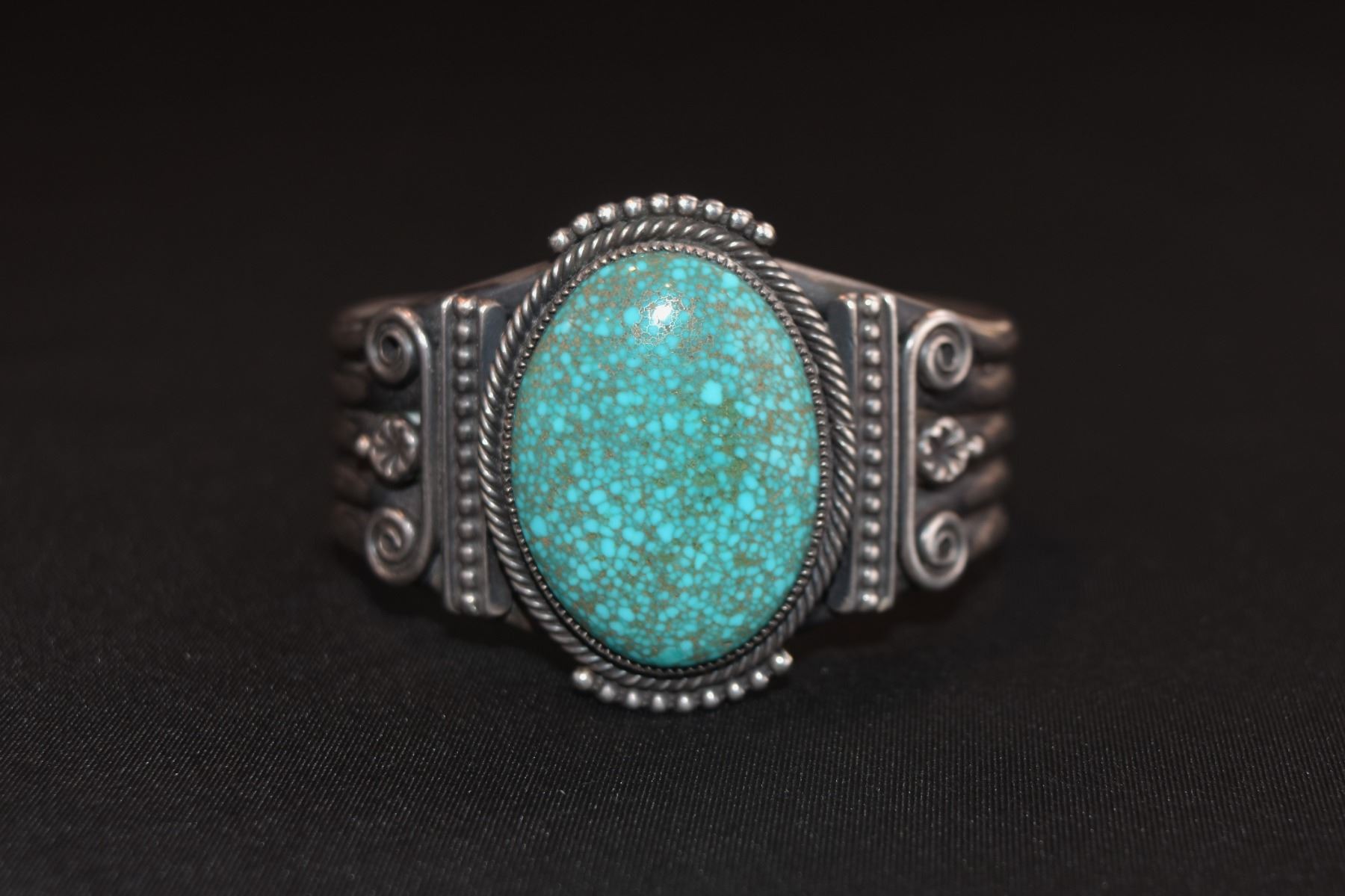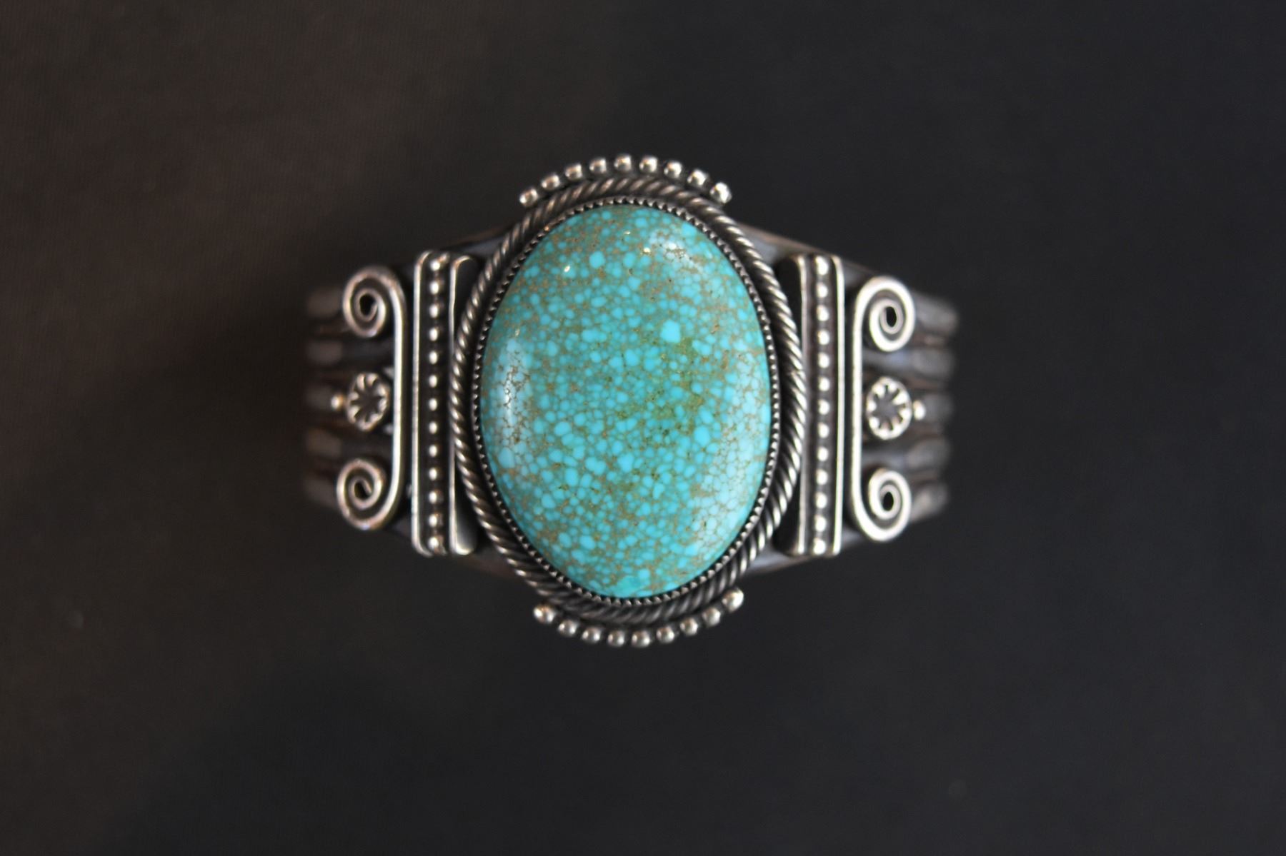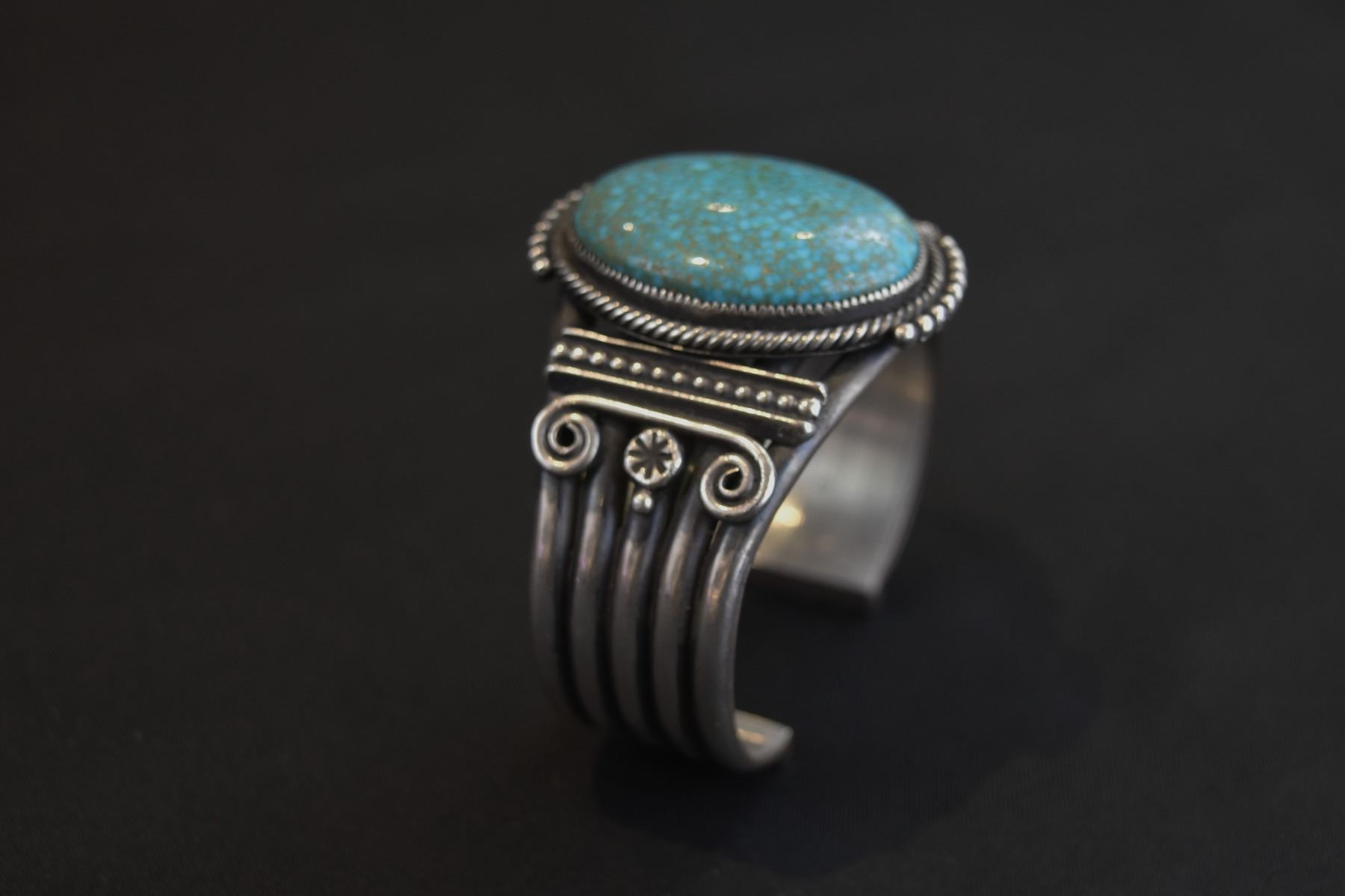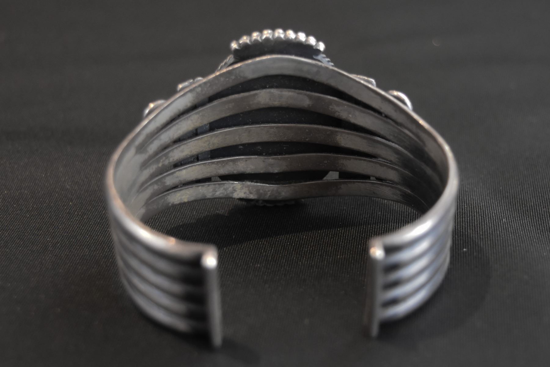 By Steven Arviso, contemporary Navaho from Gallup, who is particularly attuned to the quality and beauty of the gemstones. Diameter: 6", Gap: 1 1/8"