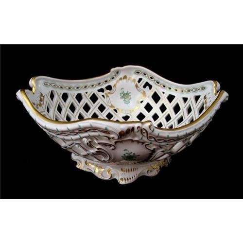 Oval open work porcelain basket in the Green Indian Basket pattern by Herend. It is marked on the underside with the blue Herend Hungary mark used after 1949. Its form number is 7438 and its pattern code FV. It also has a number 7 painted on the underside. In very good condition as shown. Please ask questions, request additional photos and shipping costs before buying.