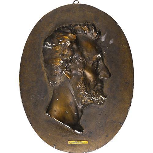 <B>Large Oval Plaster Relief of Lincoln in Profile.</B></I> Plaster with bronze finish, 19.5" x 25", bearing the etched signature "Pickett 1873" at lower left. A tiny brass plaque at the bottom indicates the piece was compliments of Lincoln National Life Insurance Company of Fort Wayne, Indiana. Several abrasions to the high spots and around the edges of the piece, else very good condition.<BR><BR><b>Shipping:</b> Miscellaneous Collectibles, Larg (<a target="_blank" href="http://www.heritageauctions.com/common/shipping.php">view shipping information</a>)