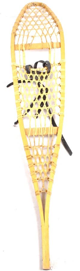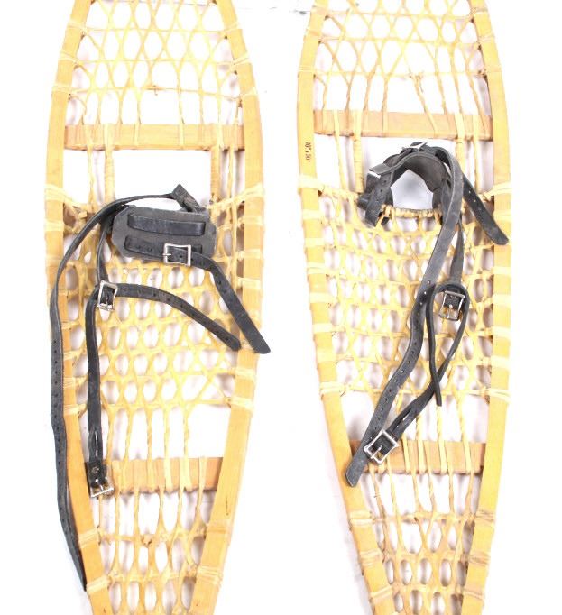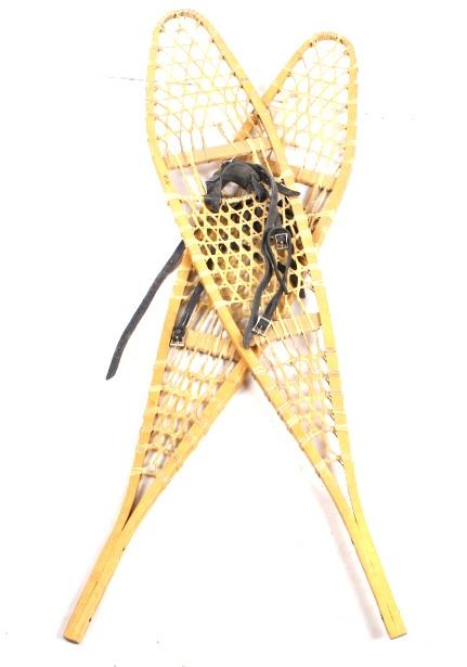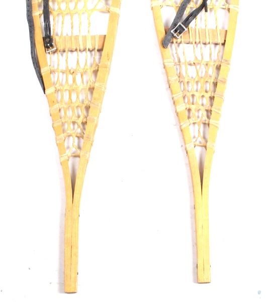 This lot features a large pair of rawhide traditional snowshoes. The pair has rawhide webbing and leather straps. They are marked with measurements 10" x 56". They make excellent cabin decor with there traditional style. In good condition for there age. Measures: 10" W x 56" L