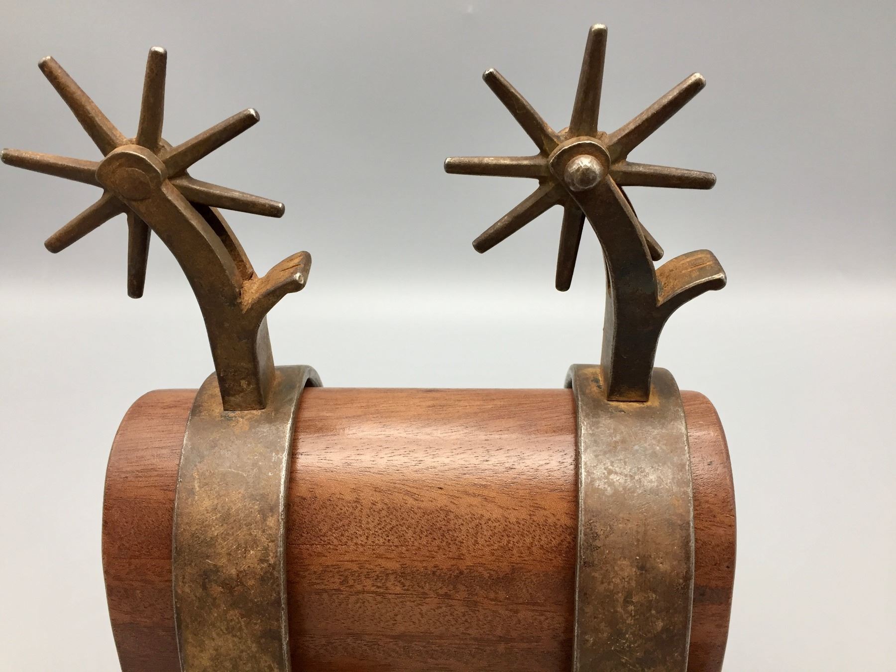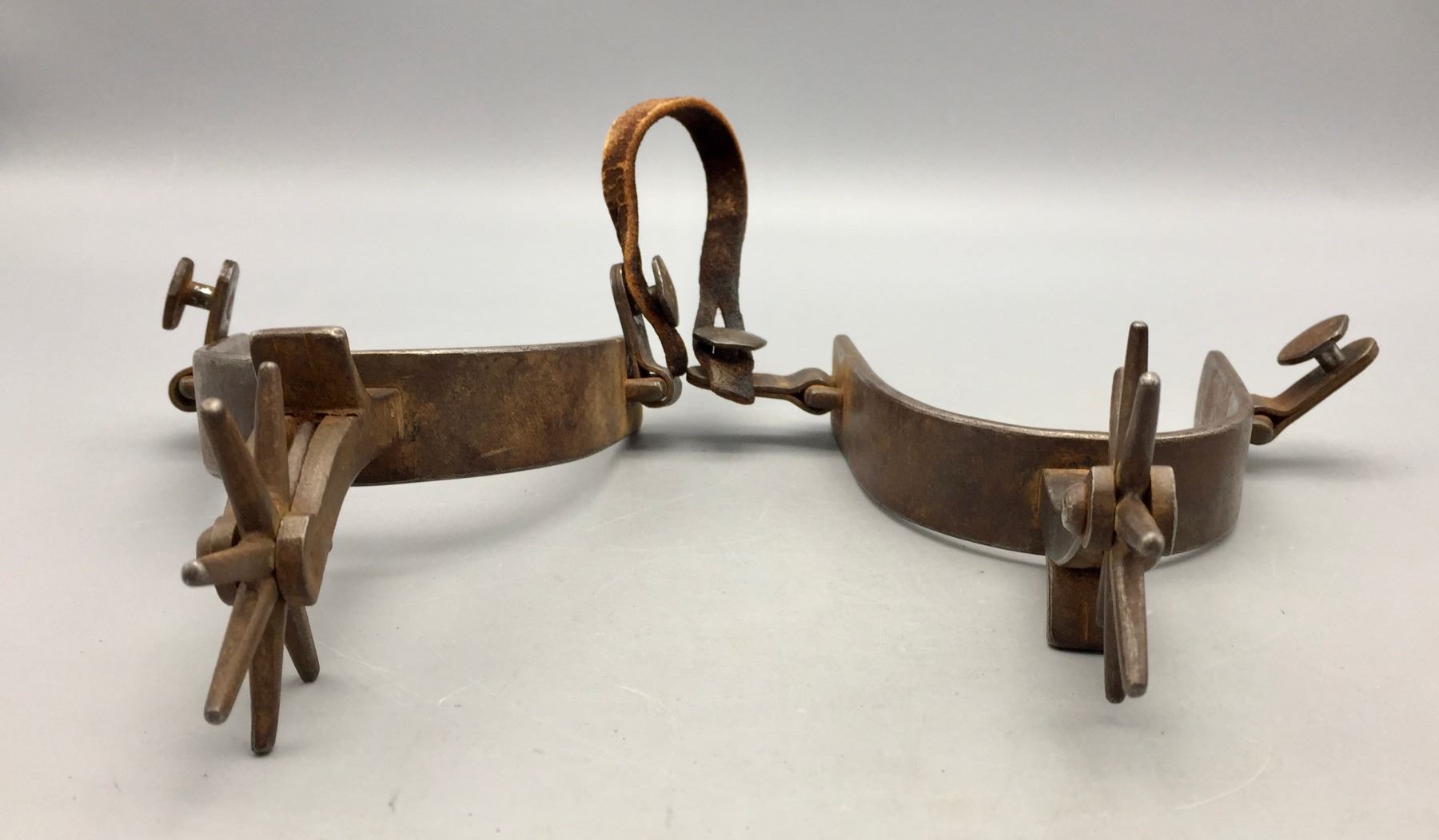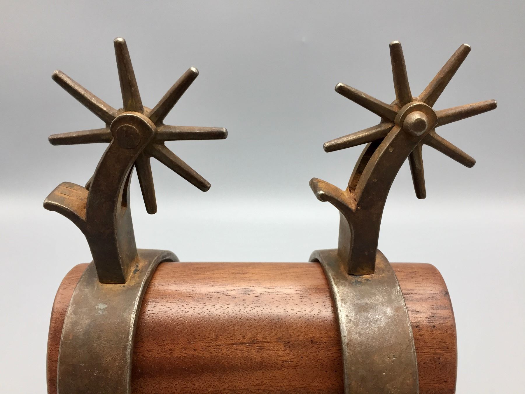 Description: Presented for sale in this lot is a large pair of cowboy spurs with chap guards. The spurs have a nice patina and look about them. Maker: Unknown, but vintage Crockett style. Approx. Age: Vintage. Size: 3-1/2” heel, 3-3/8” shank, 1” band. Condition: Good for their age, normal wear expected. Please look closely at the pictures - they are an important part of our description. Shipping: There will be a $5 handling / packaging fee for shipping this lot. The actual cost of postage will be added on top of that.