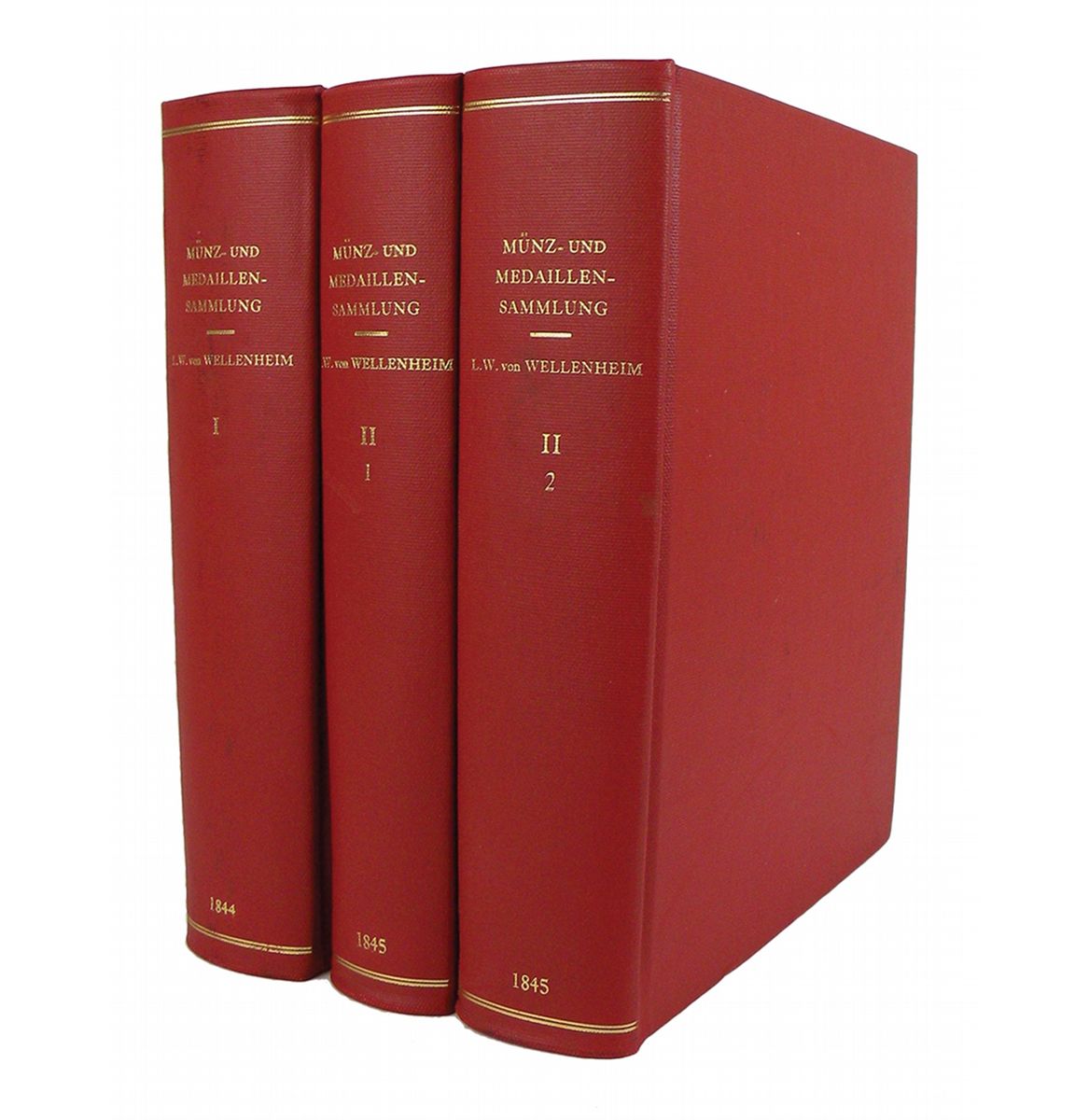 Bermann, J.B., & Sohn. VERZEICHNISS DER MÜNZ- UND MEDAILLEN-SAMMLUNG DES KAISERL. KÖNIGL. HOFRATHES UND MITGLIEDES MEHRERER GELEHRTEN GESELLSCHAFTEN, HERRN LEOPOLD WELZL VON WELLENHEIM / CATALOGUE DE LA GRANDE COLLECTION DE MONNAIES ET MÈDAILLES DE MR. LÈOPOLD WELZL DE WELLENHEIM. I. BAND / VOLUME I: CONTENANT LES MÈDAILLES ANTIQUES, GRECQUES ET ROMAINES. II. BAND. I. ABTHEILUNG. / VOLUME II. TOME I. II. BAND. II. ABTHEILUNG. / VOLUME II. TOME II. Wien: In Commission bei J.B. Bermann & Sohn, 1844-45 (sale dates: 10. Februar 1845; 7. Jönner 1846; 15. Februar und 18. October 1847). Three volumes, complete. Large thick 4to [29 by 23 cm], matching modern red cloth, gilt. (6), 380, 338, (2), 18; (4), 604, (2), 47, (1); (4), 805, (3) pages; 16,767 + 198; 12,428 + 861; 15,818 + 9 lots; ruled and priced throughout in black ink. Fine set. Large Paper Set. A remarkable collection approaching 50,000 coins and medals. The first volume features over 8000 Greek and some 9000 Roman coins, including Byzantine and later seals. The two remaining volumes are largely devoted to an amazing variety of medieval and modern European coins and medals, and an excellent numismatic library. Rare and important, particularly so for medals. Clain-Stefanelli 14141*. Ex Clain-Stefanelli Library.