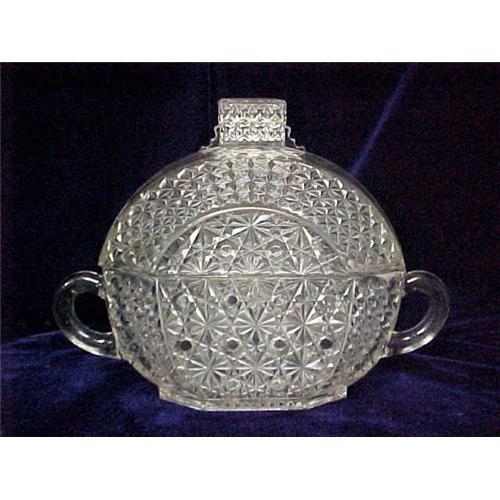 Large Patterned Covered Dish with Lid- Unknown maker- Features two loop handles and a Daisies and Buttons pattern. This dish has an unusual shape and a deep lid with a dome shape and rectangular handle on top. Including handles and lid the dish measures 7.5 x 10" approximately. Aside from chipping along the interior rim of the lid, this piece is in very good condition. Interesting and elegant, this is a perfect decorative candy dish.