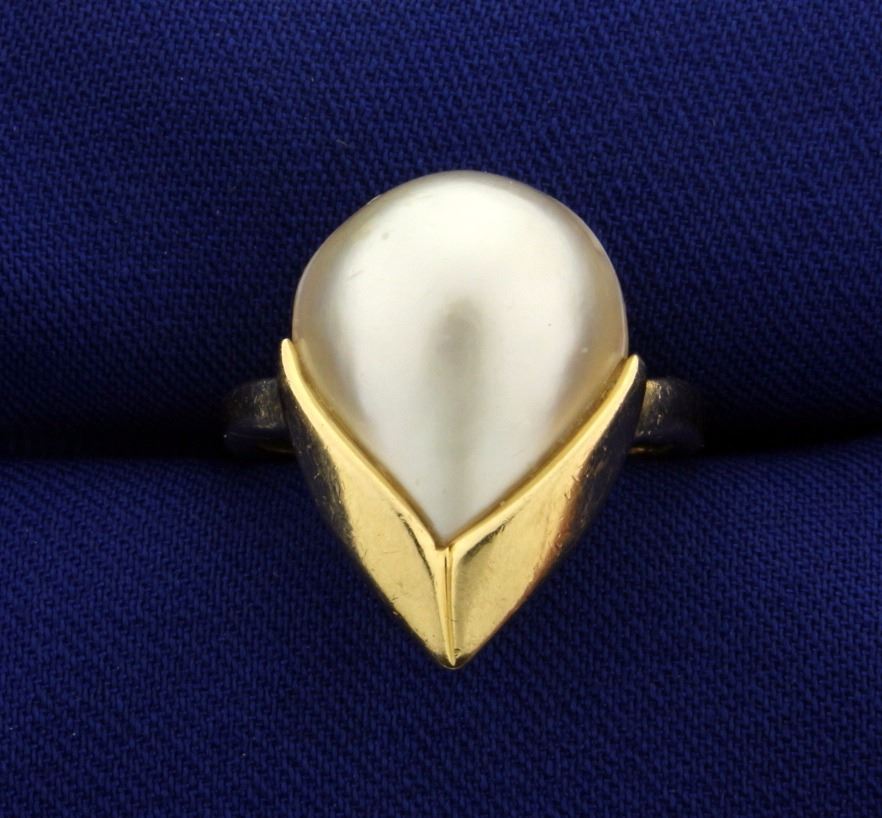 In 14k yellow gold. Pearl is 17mm long with excellent luster. Size 5 1/2. 4.3g.