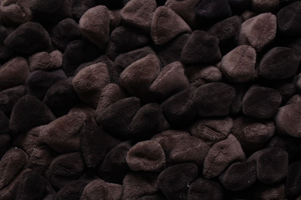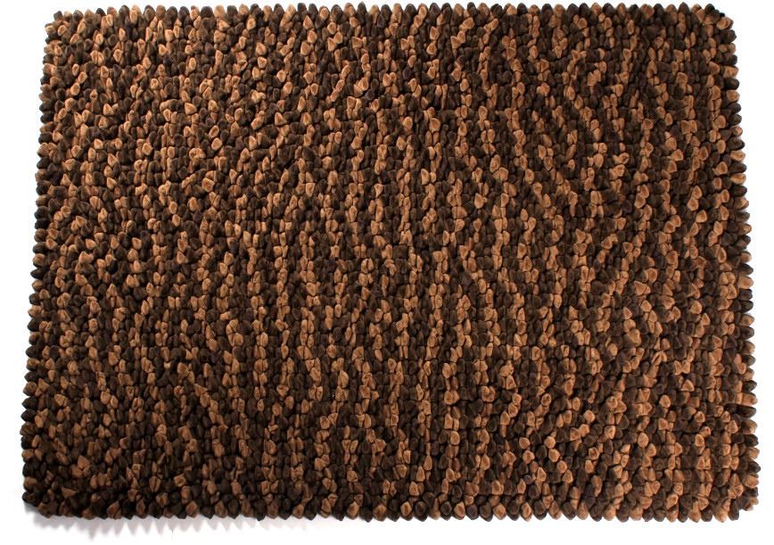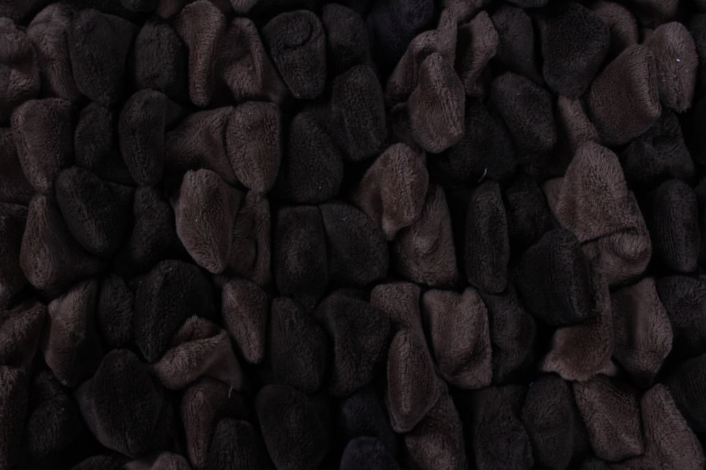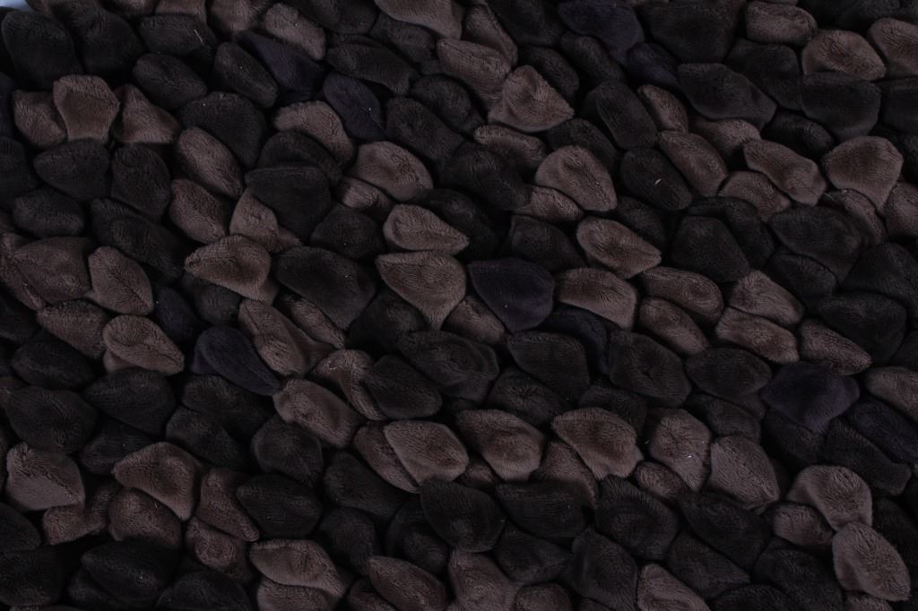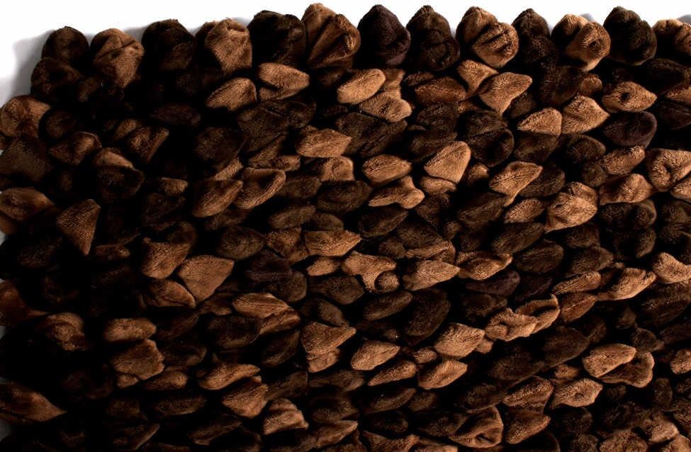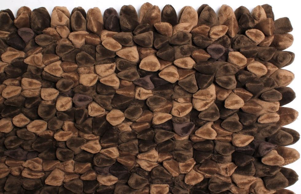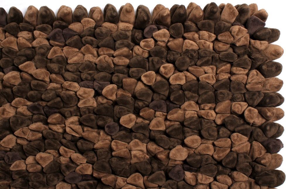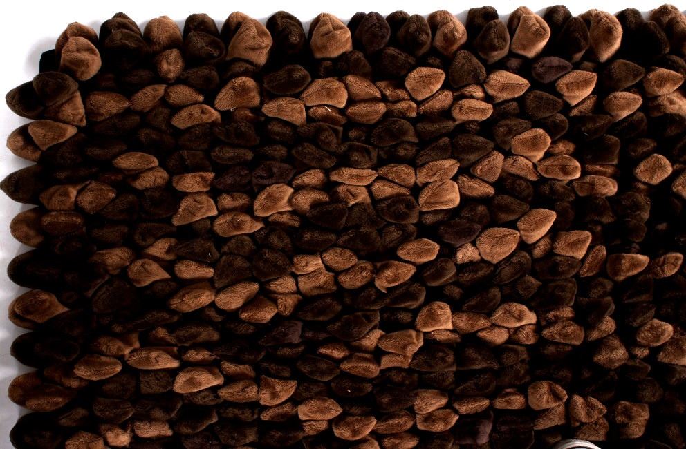 In this lot we have a Large Pebble Area Rug. This rug is two different shades of brown. There is a dark brown portion mixed with a light brown color. The backside of the rug is grey that has a lot of small beads that attach to keep the large pebbles to the rug. The underside of the pebble rug is attached to a black linen the is a 1/2" larger than the pebble rug itself. The rug is 86" x 62."