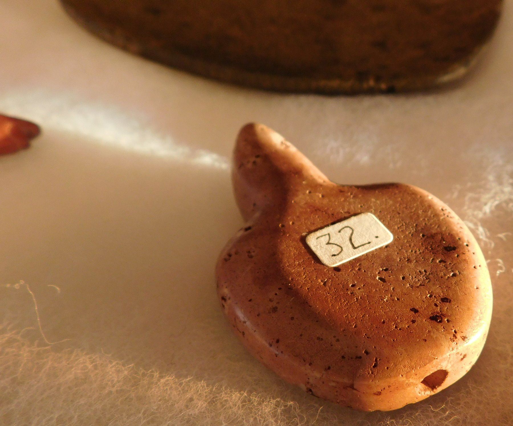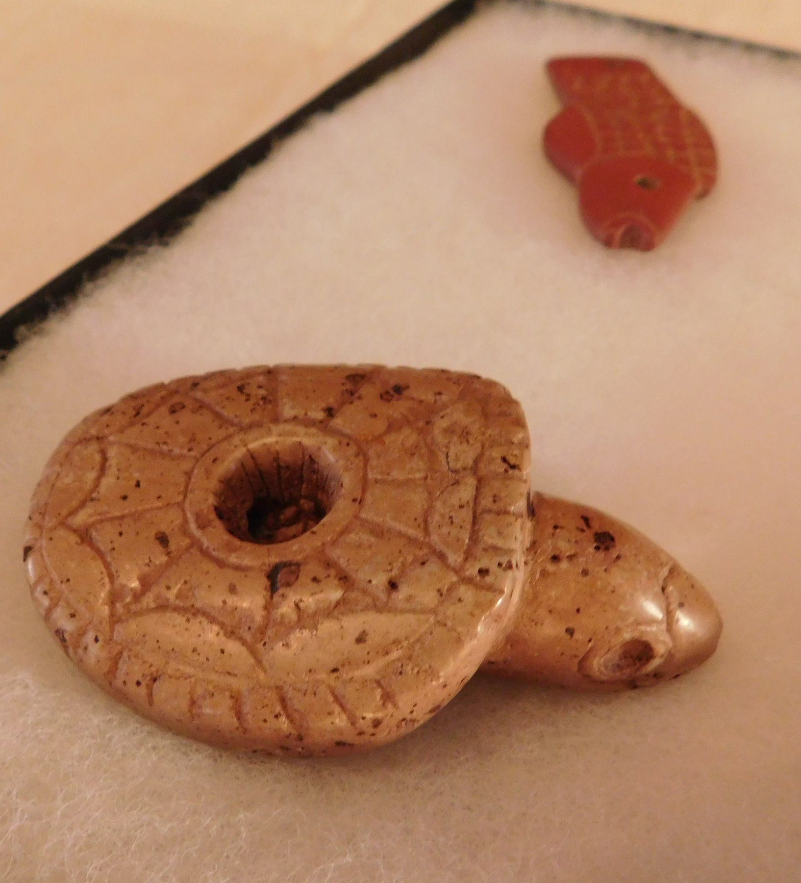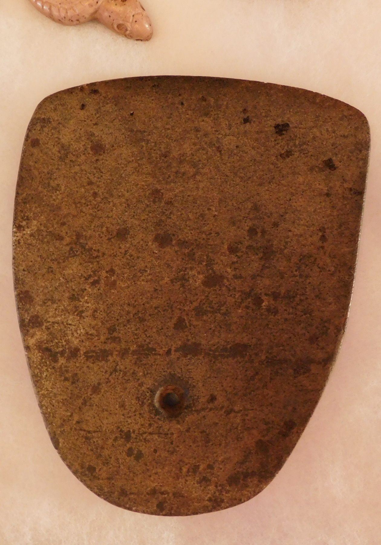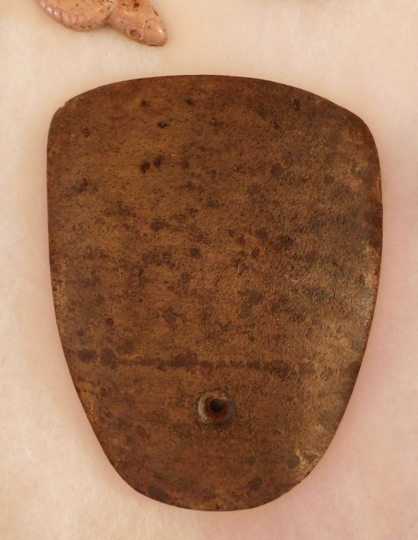 Large Pendant & Effigies, Hopewell era. Made of steatite, catlinite and pipestone, the large pendant measures 6 3/4" x 5 1/2". Logan County, Ohio. Frame not included. Condition: Good, see images. Shipping: $22.50 w/insurance and signature.