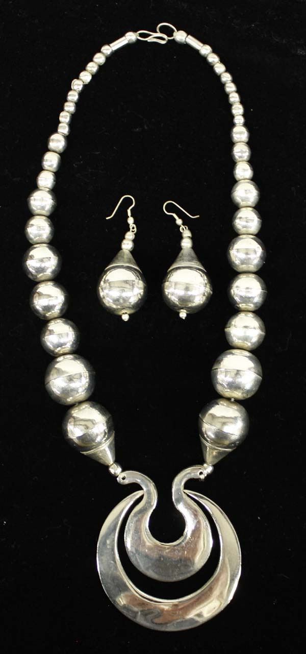 Large Vintage Pendant Necklace and Matching Earrings, necklace measures 20''L end to end, pendant drop measures 3'' x 3.5'', hollow beads, earrings measures 2.5''L which includes the wire