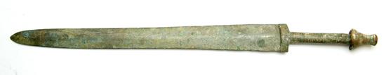 Large Persian Bronze Dagger. Circa 1st millennium B.C. Finely incised hooded hilt with long tapered blade. Lenght 19¼".