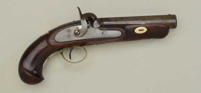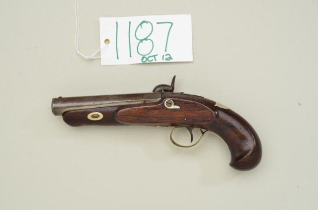 Large Philadelphia style percussion derringer possibly by Beerstecher but unsigned and single shot. The derringer measures 9” overall with 4-5/8” barrel of .44 caliber with six (6) groove rifling. The derringershows a plain un-checkered stock and non-engraved German silver mounts. The metal surfaces are in very good condition the light patina. The stocks are very good plus with a couple of mars in the forend and just normal aging. The action works well and the derringer is nicely made and closely resembles the two (2) shot that Beerstecher is known for. Est.: $1,400-$2,800