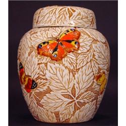 Large Phoenixware ginger jar and cover hand painted and moulded with butterflies amongst leaves, marks to base, 40cm high