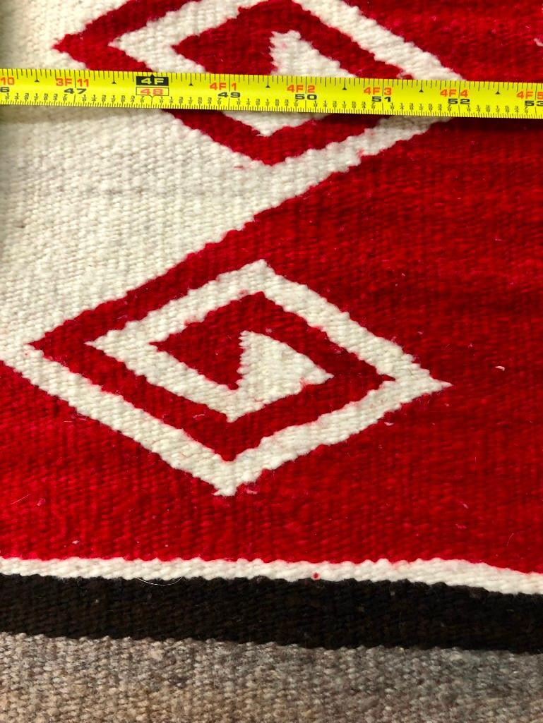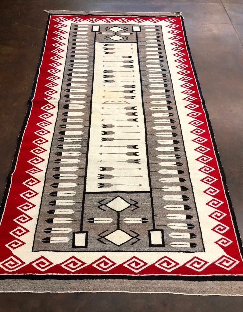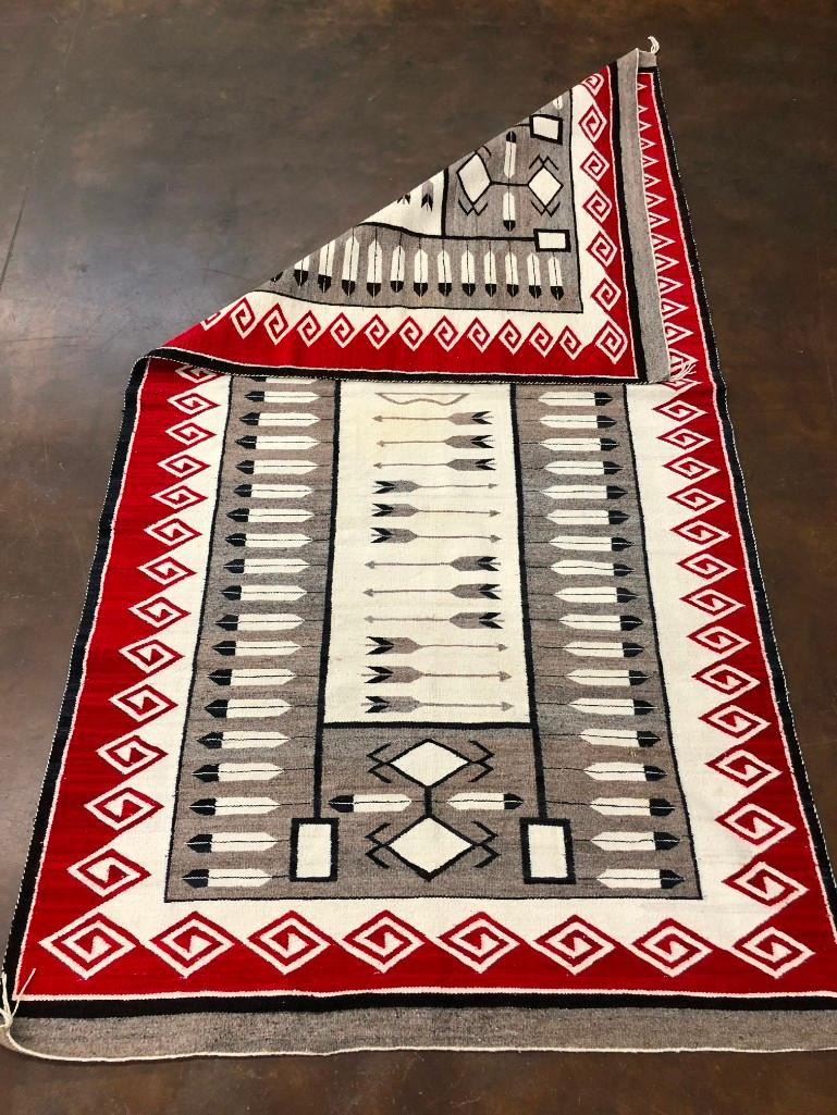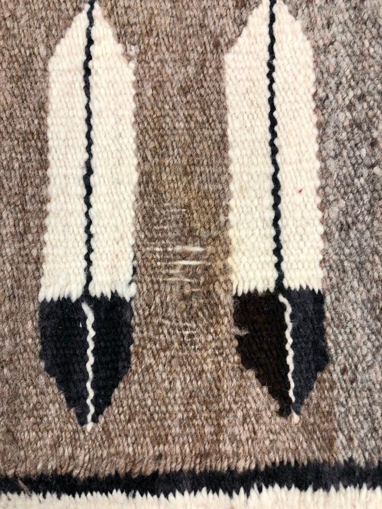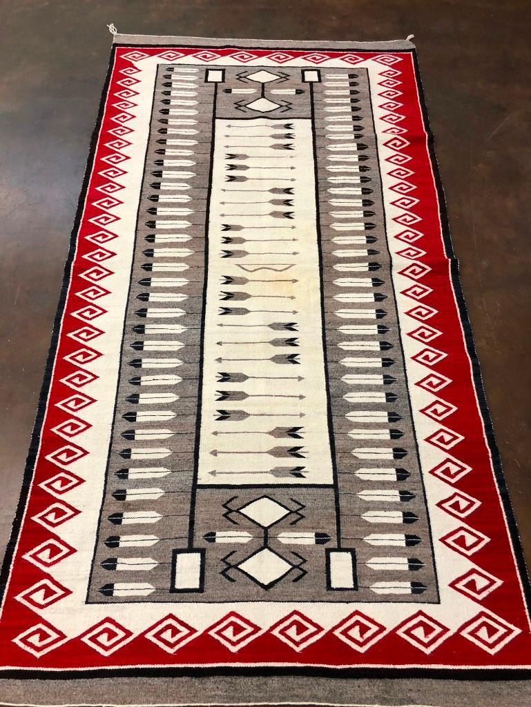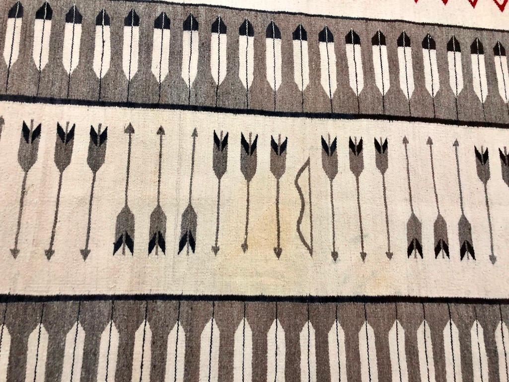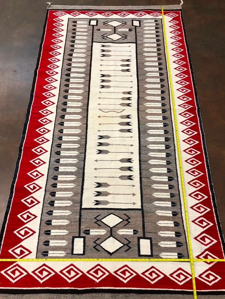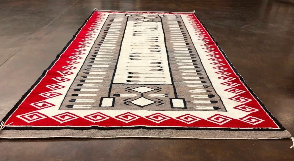 This is a great, older handmade Navajo textile. It features feathers, arrows, waterbugs, water and a storm pattern, all in pleasing colors. It is crafted from hand-spun, hand-dyed wool and is in a larger size (about 4.5 feet x 9 feet. It is in really nice shape for its age, showing just a little wear and use. MAKER: An unknown Navajo weaver. APPROX AGE: Circa 1920s. SIZE: Measures approx. 54-1/2 inches wide X 104-1/2 inches long. CONDITION: Good for its age, normal wear expected. Please look closely at the pictures as they are an important part of our description and are hereby incorporated into the description, specifically with regards to condition. SHIPPING: There will be a $8 handling / packaging fee for shipping this lot. The actual cost of postage will be added on top of that. BUY IT NOW: If you would like to buy this item now, without waiting for the auction day to bid on it, we do offer this option (which is available up to 48 hours before the actual auction starts). The “Buy it Now†price is the high estimate of this lot (plus applicable fees and the Buyer's premium is discounted to 10% when using the Buy it Now option). If you would like to exercise this option, you must contact us by email (or phone as long as you talk to someone live). Reference this lot number and your intention to "Buy it Now."